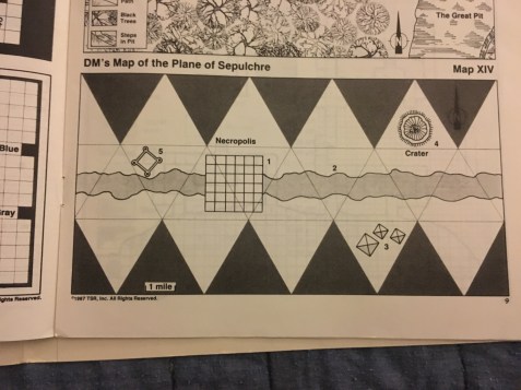 But the real star is the demiplane Sepulchre, a five-mile diameter planet of the undead, covered in gravestones that constantly update with the newly deceased and orbited by a MALEVOLENT LIVING MOON. Check out that map — that’s the whole planet, in 20-sided polyhedron form, unfolded!