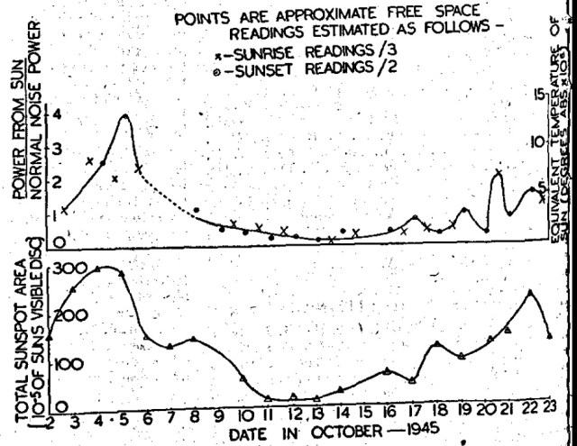 Even more significant, however, is the bottom half of the figure. After their experiments were concluded, they compared their radio frequency data with measurements of sunspots taken by Dr. C.W. Allen of the Mt. Stromlo Solar Physics Observatory in Canberra. As can be seen, the data clearly shows that the total area of sunspots on the surface of the sun correlates quite closely with the amount of radio frequency energy emanating from the sun. To reconcile their results with the previous work of Jansky, the trio of researchers suggested that the extraterrestrial signals that Jansky had observed were radio signals coming from other stars in the galaxy, not from interstellar space.