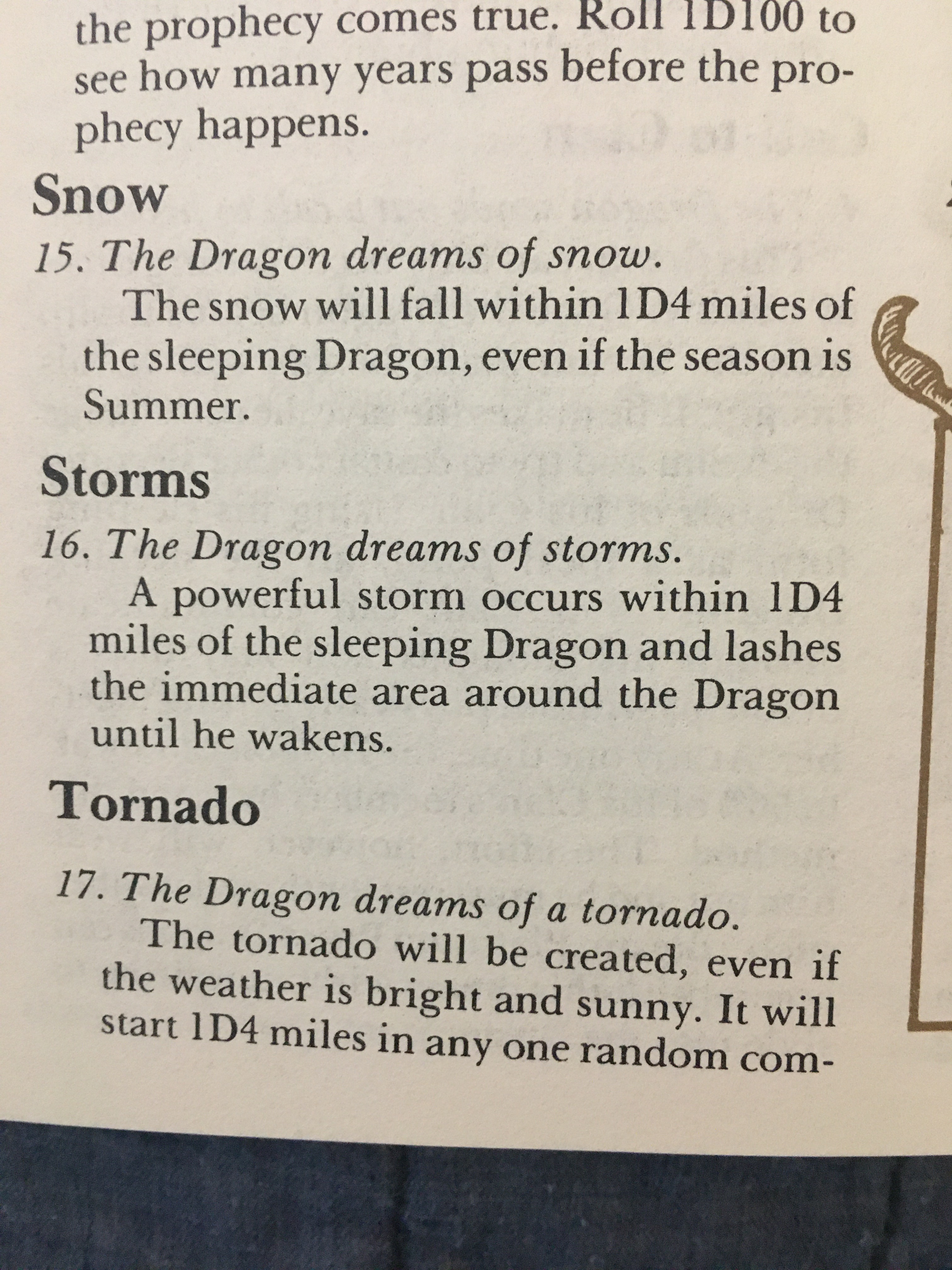 One set of rules that I really like adds to the magic of dragons through their dreams. When dragons dream, they alter the world around them, changing the weather or even causing catastrophic events to happen! There’s a random table to roll for a dream.