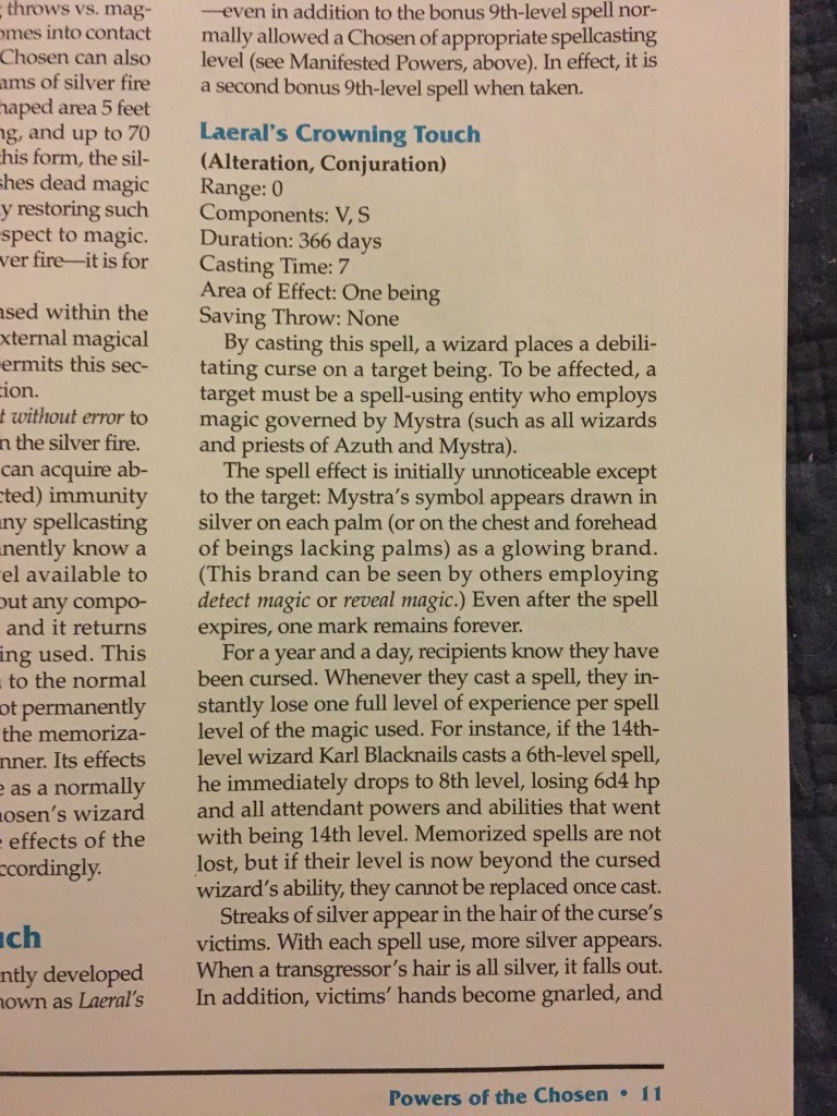 The sourcebook includes incredibly powerful spells created by the Sisters in their magical research. For example, there’s this devastating curse on a wizard, where the wizard LOSES EXPERIENCE LEVELS EQUAL TO THE SPELL LEVEL every time they cast a spell!