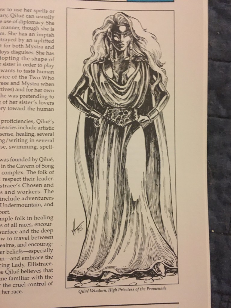 And there is Qilué Veladorn, a drow cleric who serves both Mystra and the good-aligned drow goddess Ellistraee.
