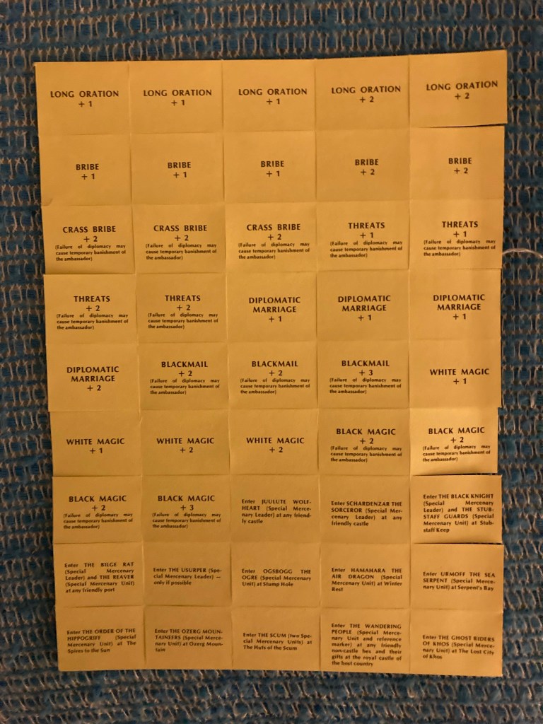What really strikes me about Divine Right is how Game of Thrones-y it feels, long before the novels appeared. One can use diplomats to make or break alliances, enlist mercenaries or barbarians, kill other diplomats or even murder an enemy ruler! Here are some diplomacy cards.