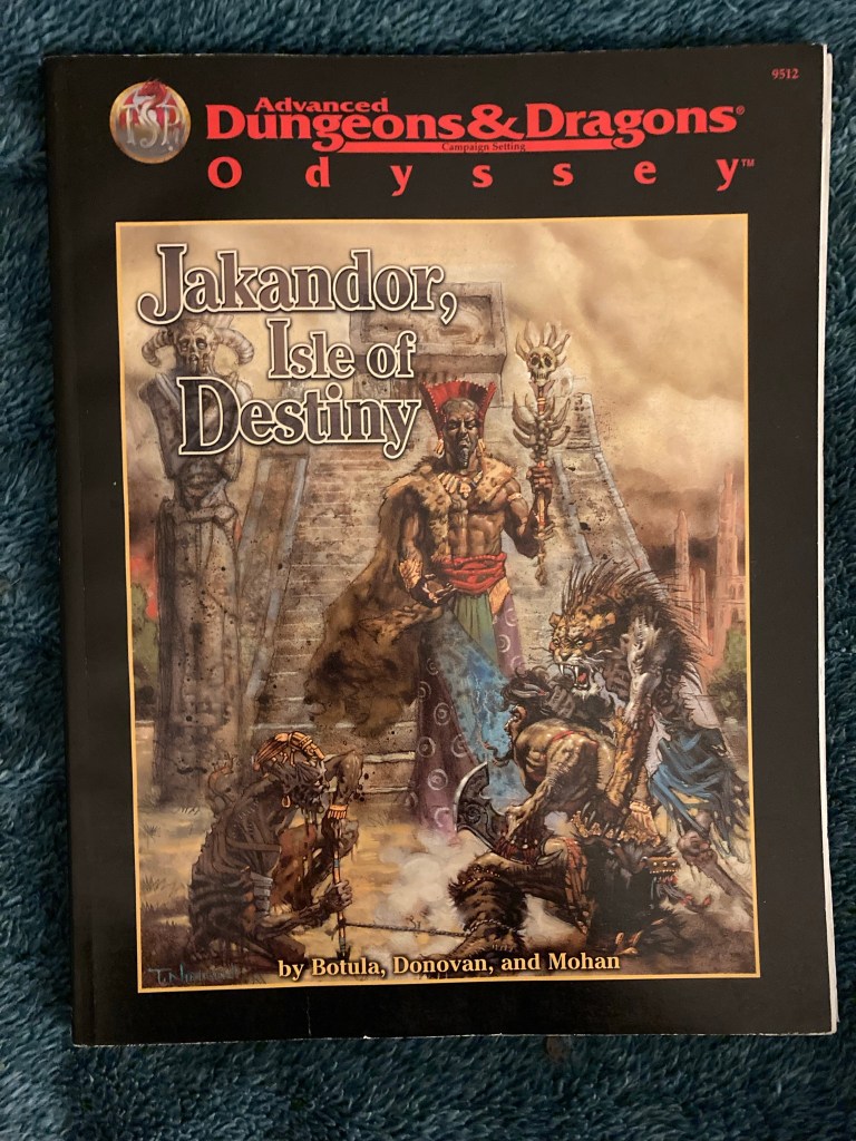 Jakandor: Isle of Destiny (1998), by Botula, Donovan and Mohan. This is one of the late TSR era products, right as TSR was folding and being bought out by Wizards of the Coast. Apparently the setting was created by TSR icon Jeff Grubb, but the books were written by others. It is one of those products I had never even heard of until I found a used copy!
