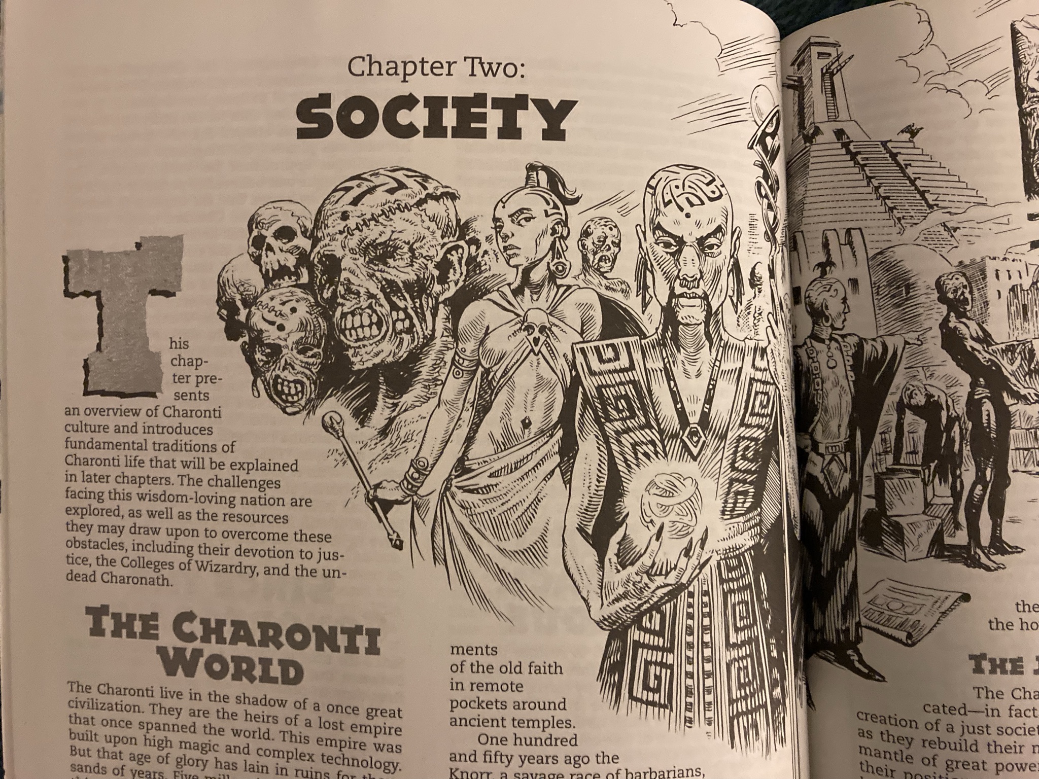 The threat of the invading Knorr caused the warring remnants of the civilization to band back together, and now they seek to reclaim lost magical knowledge. Lots of dungeon explorations as Charonti would be hunts for old magic — a neat idea.