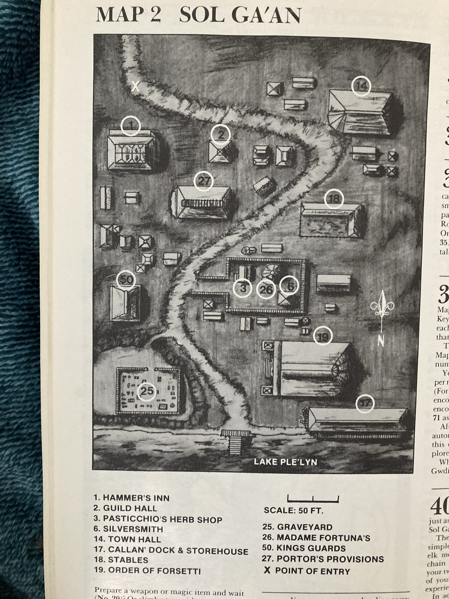You start by exploring a local town, looking for clues to defeat Gwdion. The different buildings are keyed to different numbered entries in the book. After a few investigations, you are directed to an automatic encounter with unfriendly town guard.