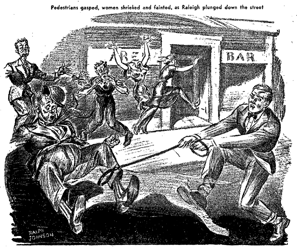 The invisibility elixir works perfectly, and Raleigh goes out and performs the assignment. However, while he is out, a nearby bank is robbed by an invisible bandit, and Meek is arrested for the crime, being the only person who has claimed to have the power of invisibility. Raleigh sets out to find the true criminal and clear Meek’s name, and many hijinks ensue. This includes accidentally turning Binnie’s dog invisible and leading him on a hunt for the bank robber through the streets, as illustrated below.