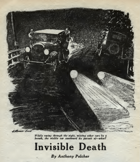 “Invisible Death” counts as a mystery/thriller invisibility story. As the tale begins, a reclusive and mysterious inventor named Darius Darrow has been found dead, and an inquest opened into the cause of death. His wife, Susan Darrow, describes how her husband had built two prototypes of a device that he said would “do away with war,” but on the day of his death, he said that he must have displaced one of them. Soon after, he was found dead, with a fatal blow to his head, and strange events followed. The gardener claimed to have been pushed over by something unseen, and Susan had noticed a strange car parked near their house all day. As she went to look at it again, it simply vanished!