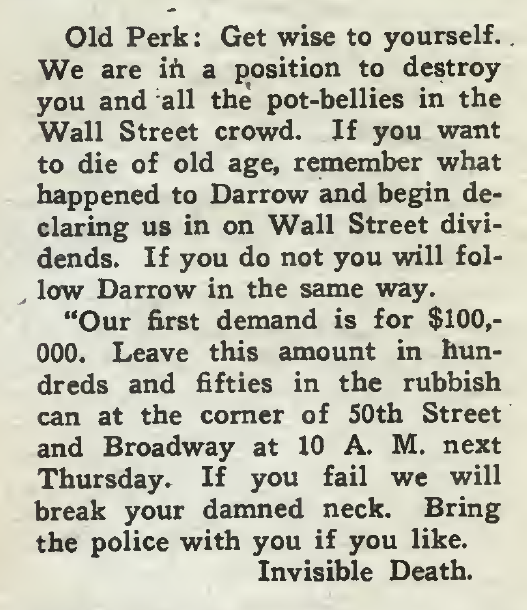 The inquest cannot pinpoint a cause of death, but it is concerning to Darius’ employers, Perkins Ferguson, head of the Schefert Engineering Corporation, and the vice-president of the company, Damon Farnsworth. At a board meeting, Perkins “Old Perk” reveals that he has received an ominous, threatening, and extorting letter: