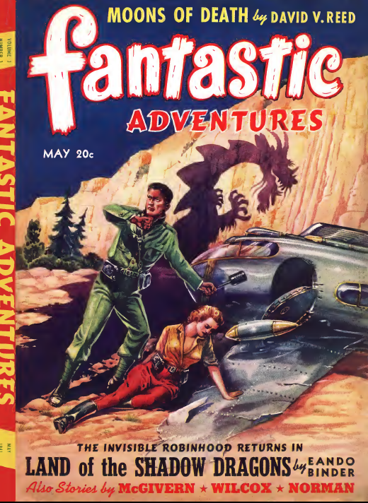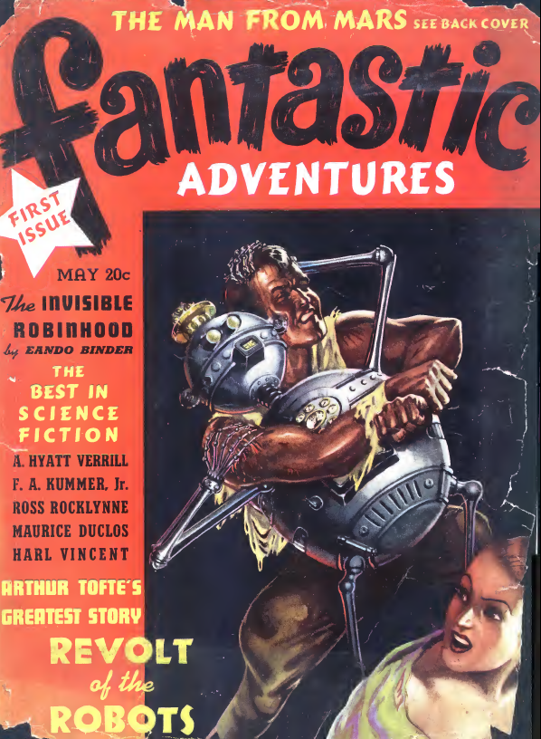 The scene you are reading is from “The Invisible Robinhood,” written by Eando Binder, which appeared in the May 1939 issue of Fantastic Adventures, indeed the very first issue of that magazine!