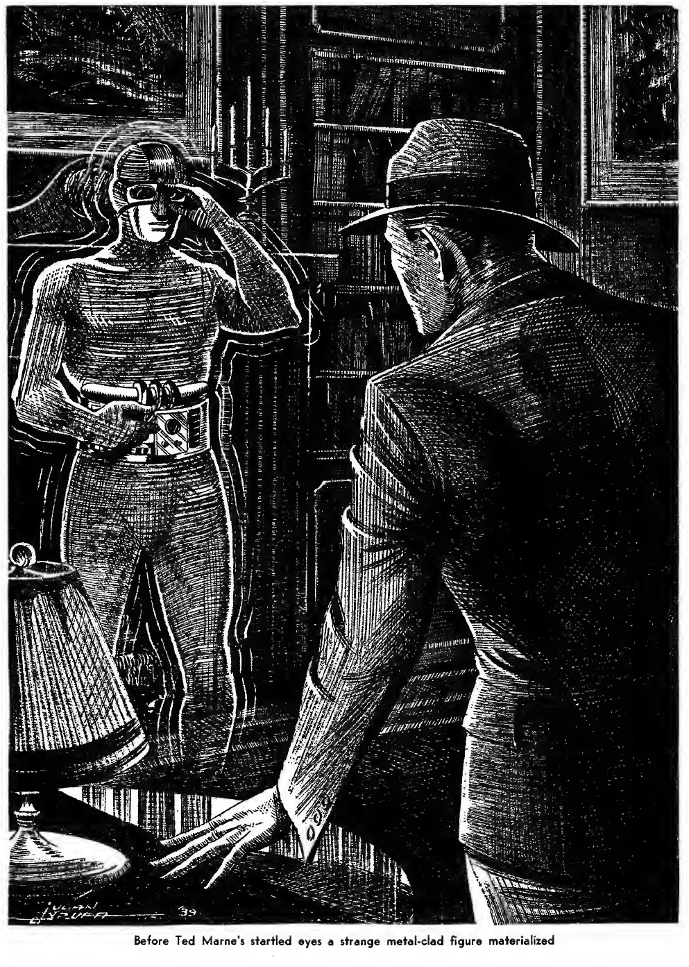 A switch snapped. With startling abruptness, Marne saw a figure before him. It was completely sheathed in what looked like fine chain-mail. The gauntleted hands reached up to unfasten the helmetlike hood.