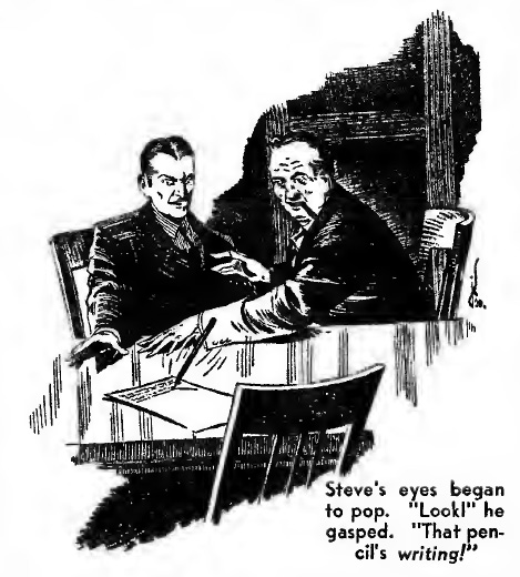 ”I dont think you will!” said another voice. The gunman whirled, tensely, ready to shoot. He saw nothing to shoot at. But something like a steel hand grasped his wrist and twisted it sharply. He dropped his gun with a cry of agony.
