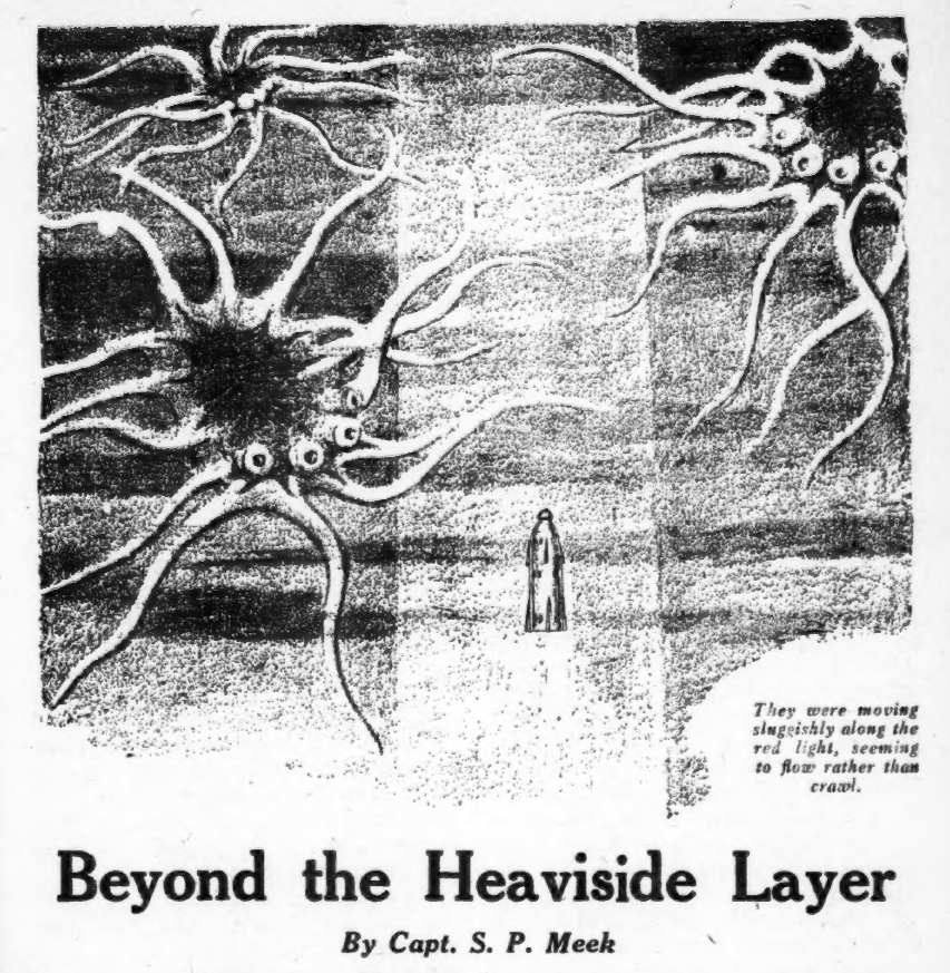 This idea of a “barrier” to radio waves seems to have inspired Captain Meek to imagine the Heaviside layer instead as a solid, viscous fluid that surrounds the Earth. In “Beyond the Heaviside Layer,” a rocket engineer named Jim Carpenter takes a journalist named Bond up in a rocket and they blast their way through the layer, finding all sorts of strange and alien creatures beyond.