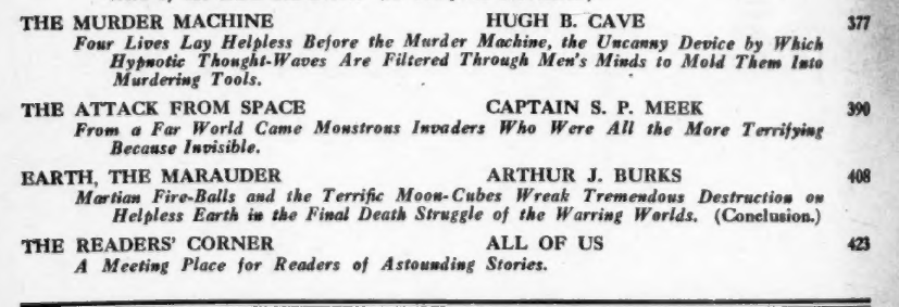 Today’s story is from another addict of invisibility, Captain S.P. Meek, who also wrote “The Cave of Horror,” which appeared in the January 1930 issue of Astounding Stories of Super-Science. Fast forward to September of 1930, and we find that Meek has another story, “The Attack From Space!”