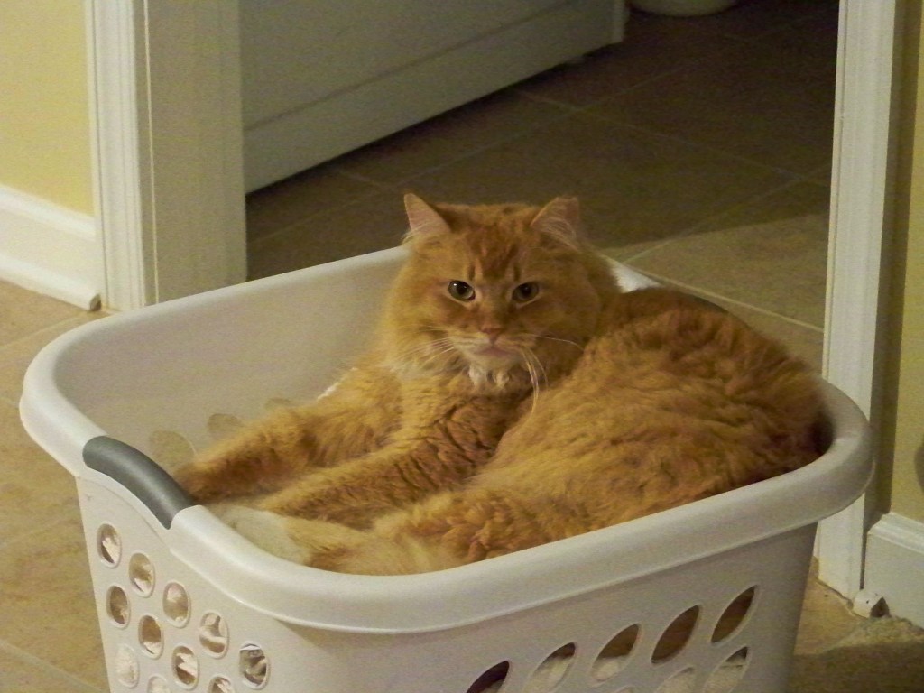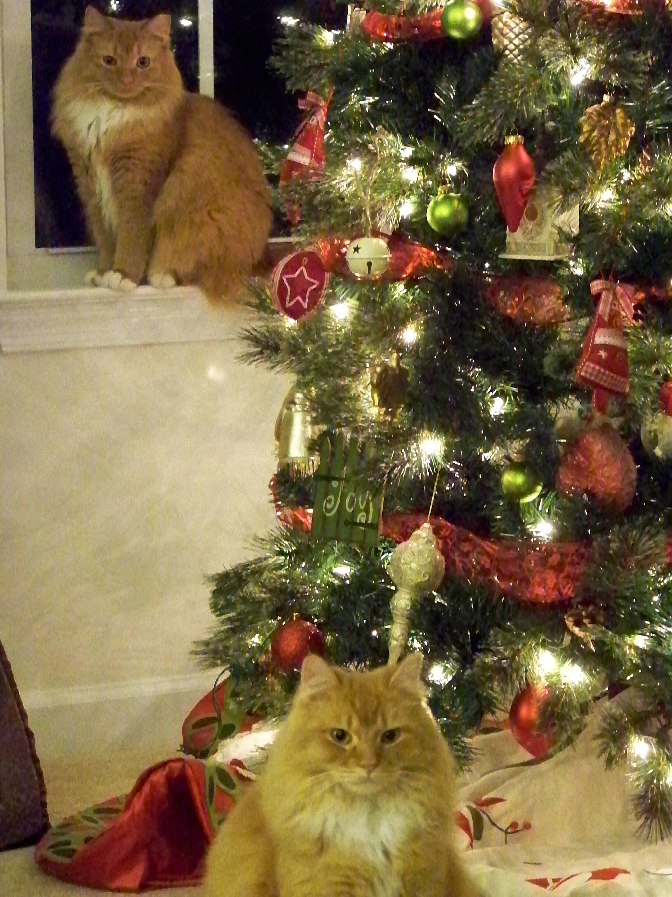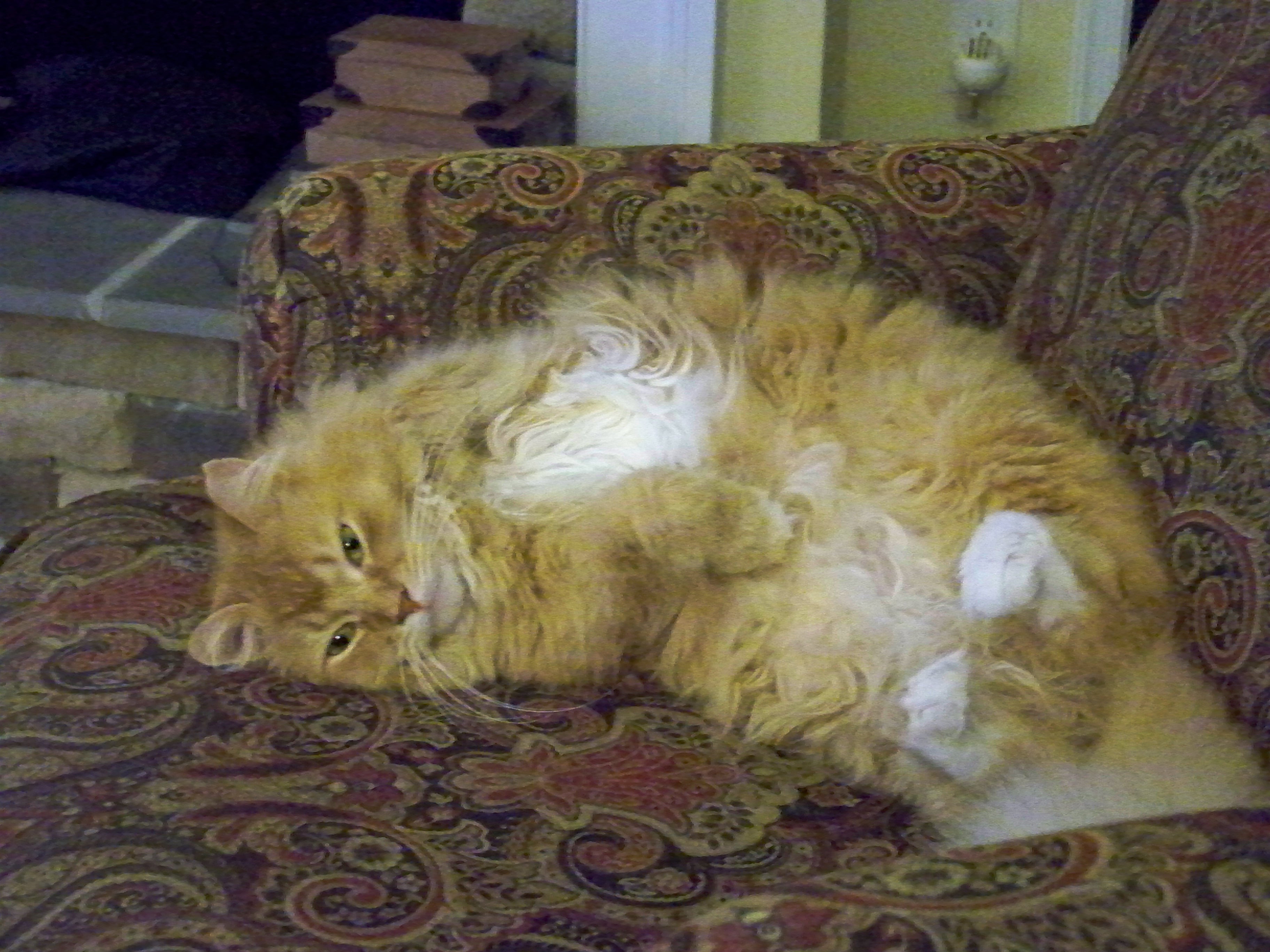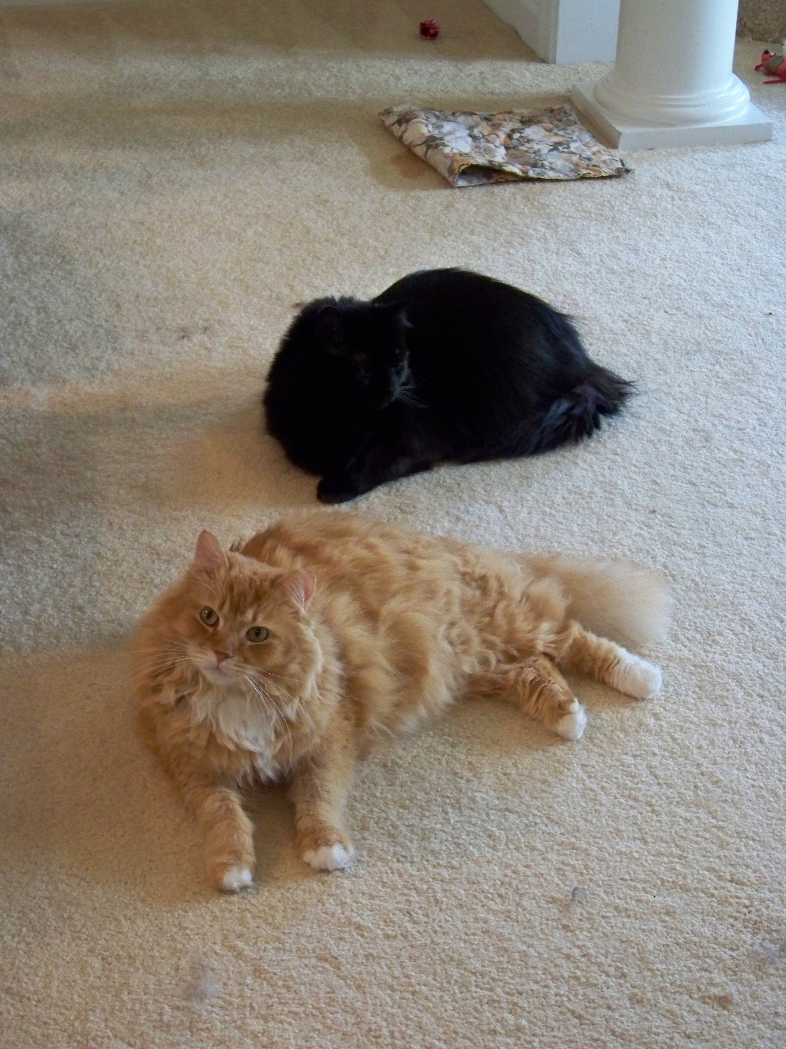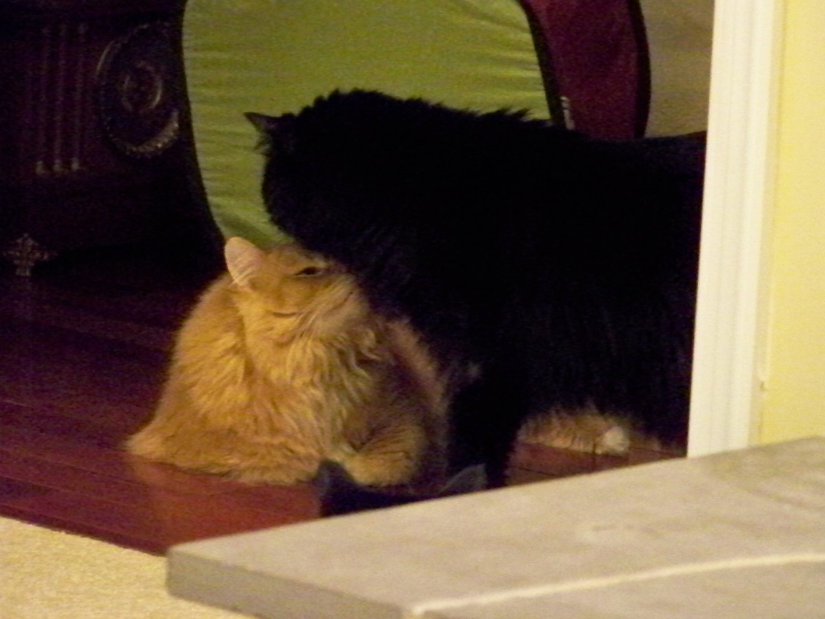 Mandarin got along well with the other cats for the most part. One example of this was an incident with our late kitty Simon, who I’ve written about before. In August of 2012, when I was home alone, Mandarin somehow got a lamp cord wrapped around his neck and he panicked and was trapped under the dining room table. He was flailing about and screeching and the other cats were trying to attack him because of it. I managed to get the cord off of him (with some scratches for my effort) and he went to hide under the couch for a while. When he came out later, calmer, Simon came over to check on him.