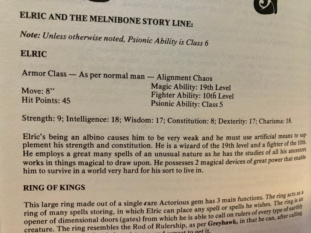 GD&H also included the Elric pantheon, with stats for Elric. Famously, these would be removed from later editions of Deities and Demigods because TSR didn’t want to promote competitor Chaosium’s games and stories.