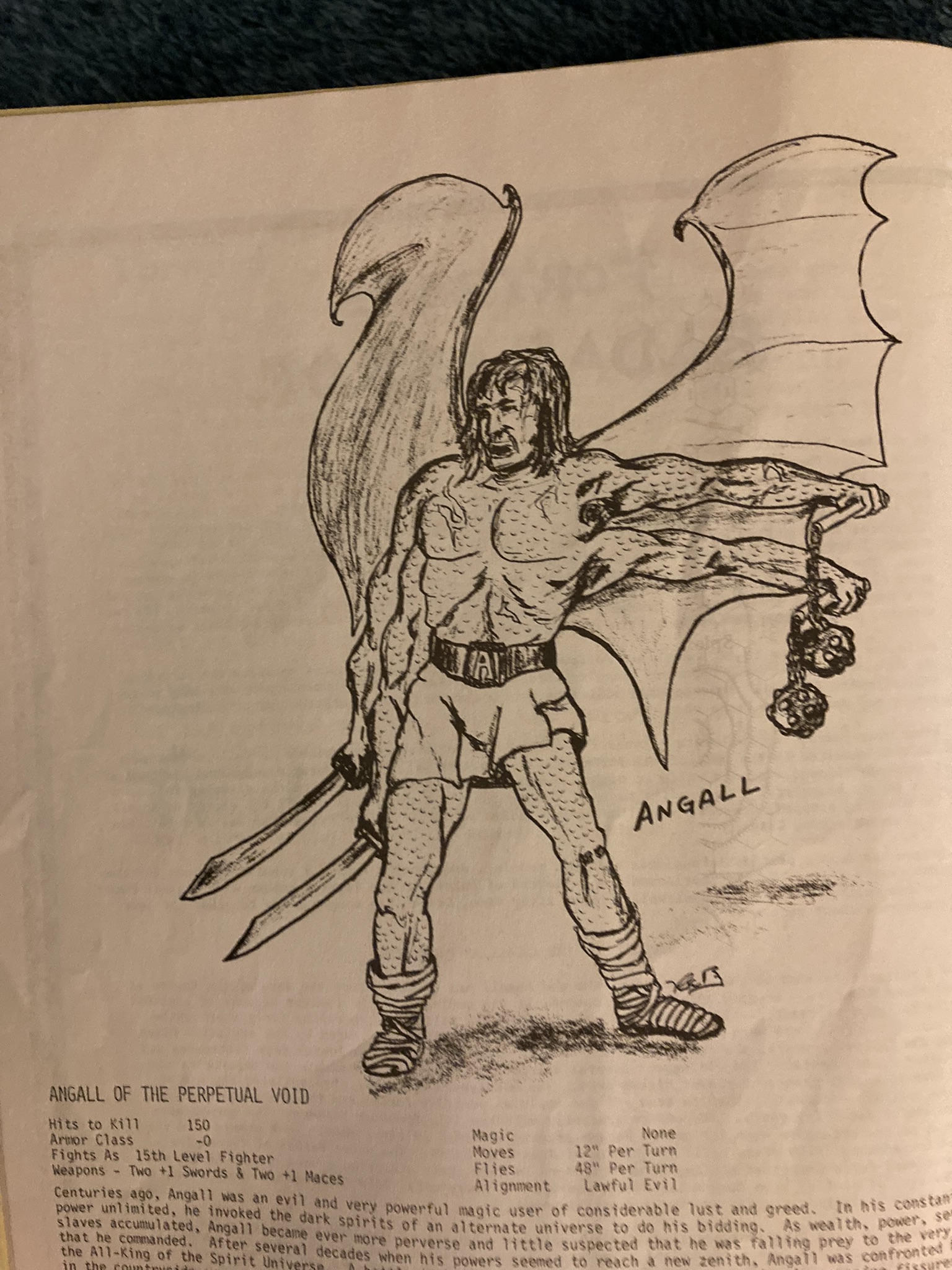 The Fortress itself is described as a former imperial outpost, taken over by an odd combination of bandits and cultists of the god Angall. Being old school D&D, of course, the stats of Angall are given for completeness.