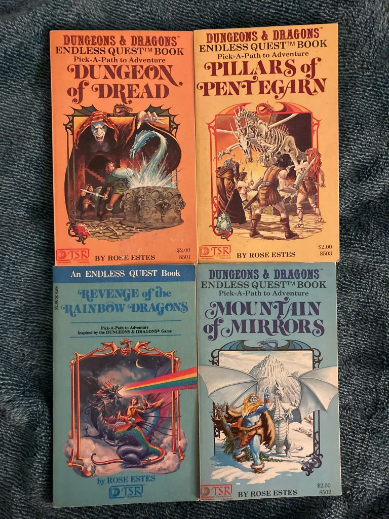 If you don’t know the format: the books present the reader with choices at key moments, directing you to different pages depending on your choice. Thus you “pick” a “path” through the book, with different endings possible, some good, some horrific. I still have four of my original Endless Quest books, and I focus on Pillars of Pentegarn because it is the one burned into my brain: it is practically a horror story!