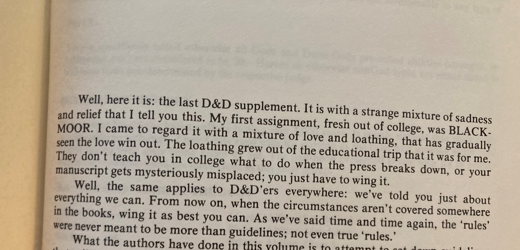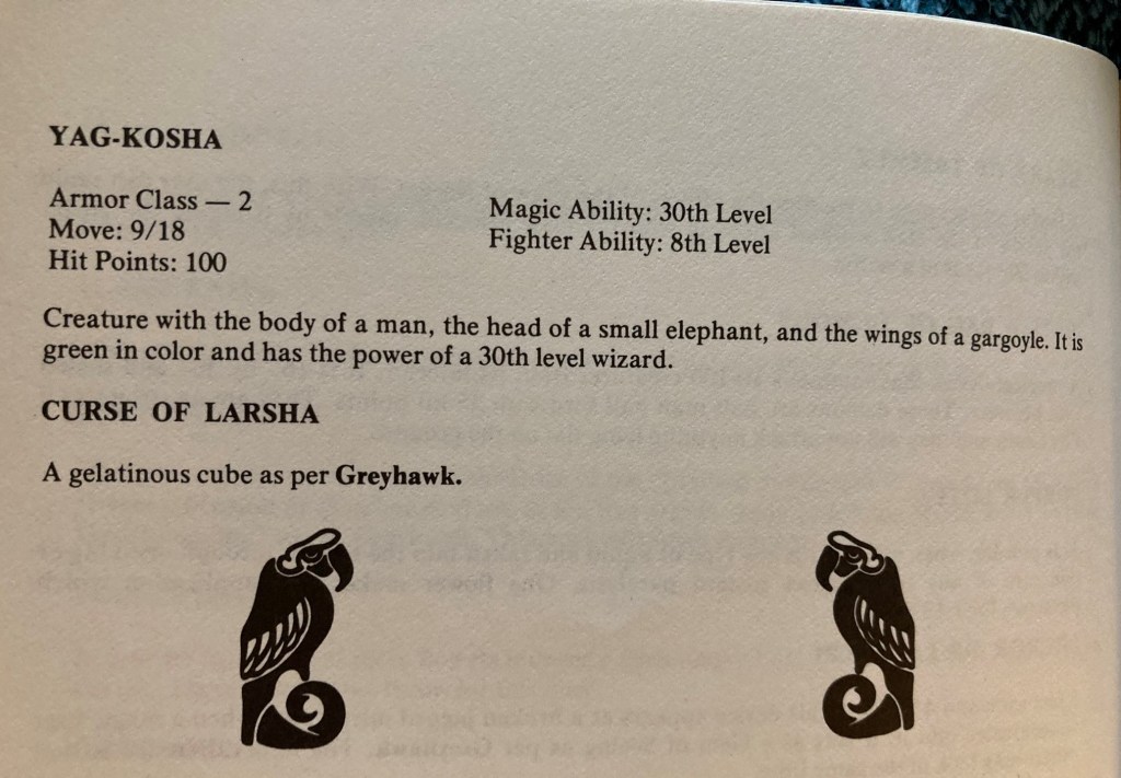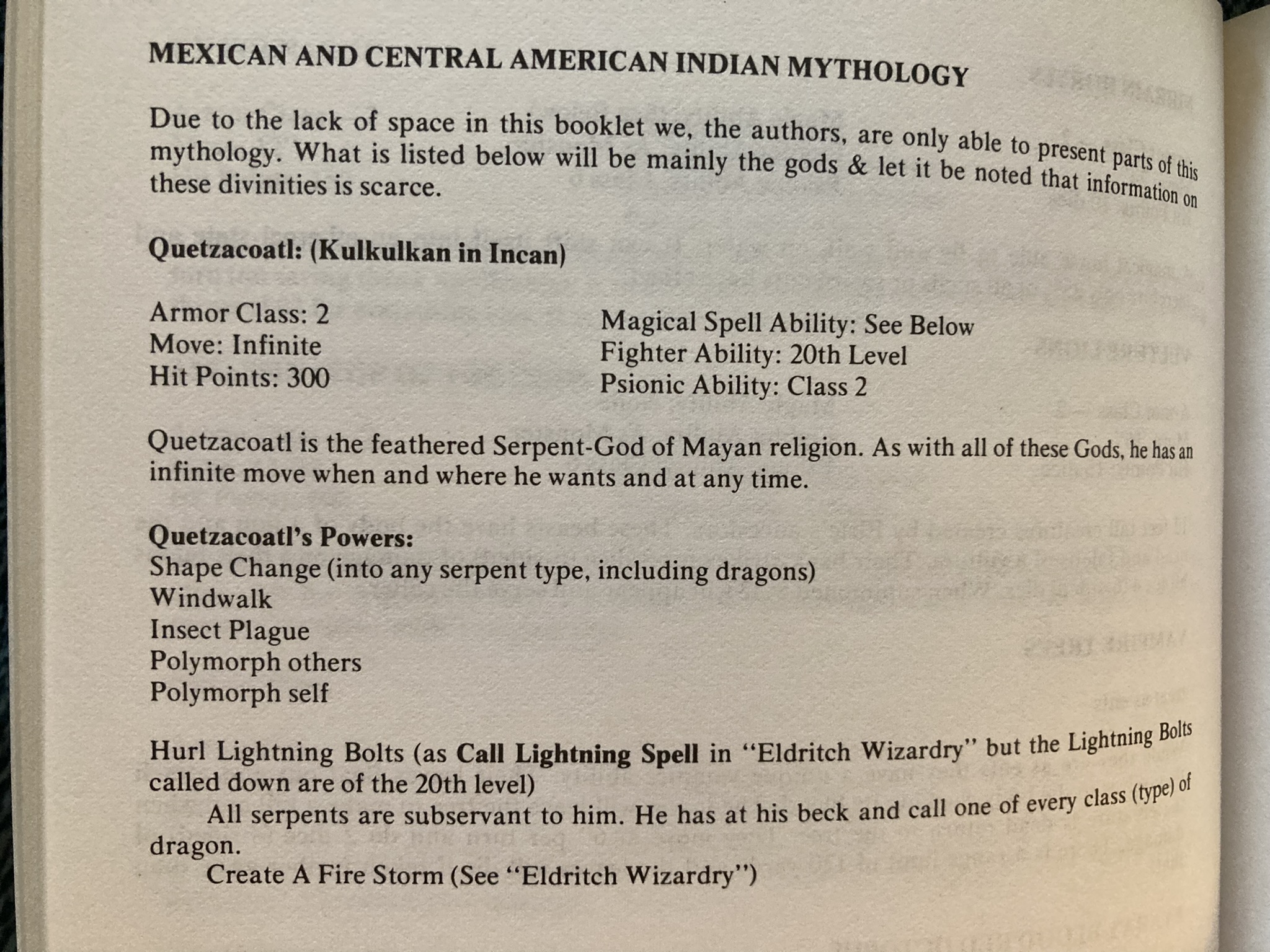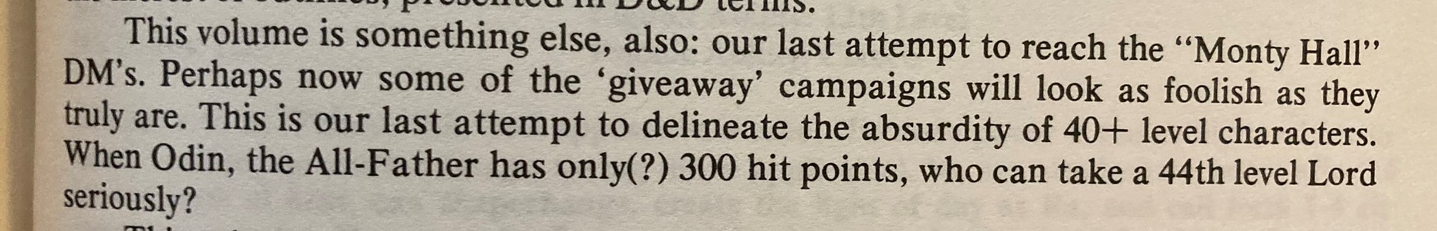 Curiously, the latter part of the foreword shows that the book was designed to address another early problem in D&D: power “Monty Haul” gamers! Basically: “Here are the stats of literal gods. If your characters are more powerful, you’re doing something wrong.”
