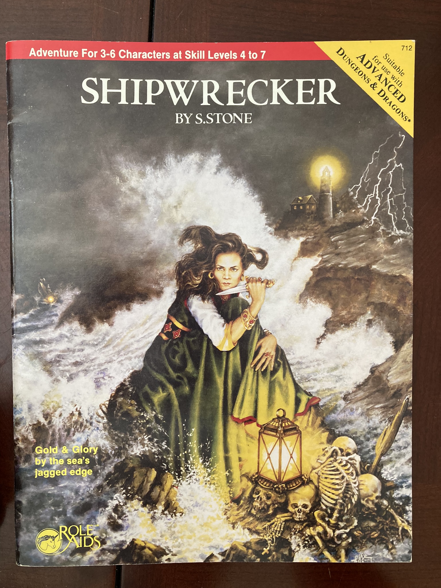 Shipwrecker (1983), by Sue Stone. Shipwrecker is another product of Mayfair Games’ Role Aids line, which printed unauthorized D&D adventures. Many of these were surprisingly good and imaginative, though there were a lot of uninspiring ones, too (same for TSR, though).
