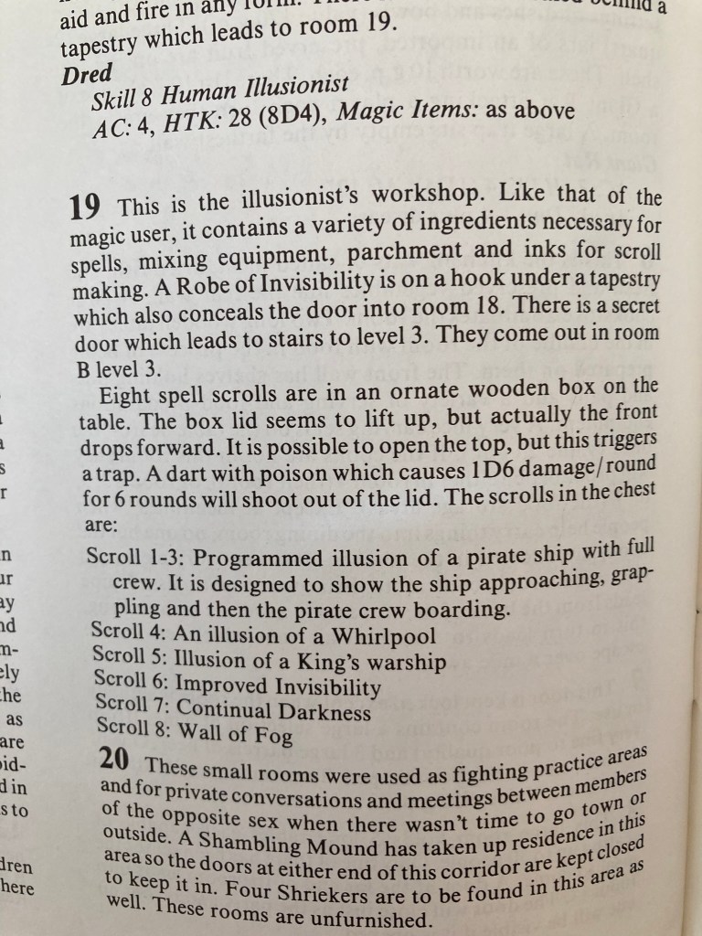 Overall, there isn’t much that stands out in the dungeon, but I enjoyed this description of a pirate illusiionist’s ready-made spell scrolls.