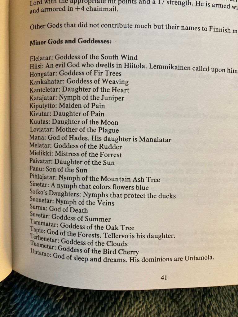 It was a bit of fun nostalgia for me to see the minor Finnish gods, because my very first D&D cleric worshipped Loviatar (from Deities and Demigods), which was admittedly a random choice.