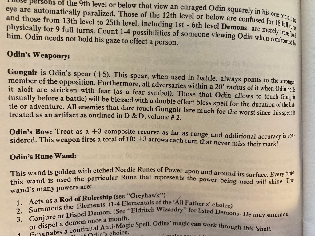Odin gets a LOT of detail, including his weaponry. I love the editorial decision to allow an exclamation point to highlight the *10* arrow attacks, which admittedly is quite a few!
