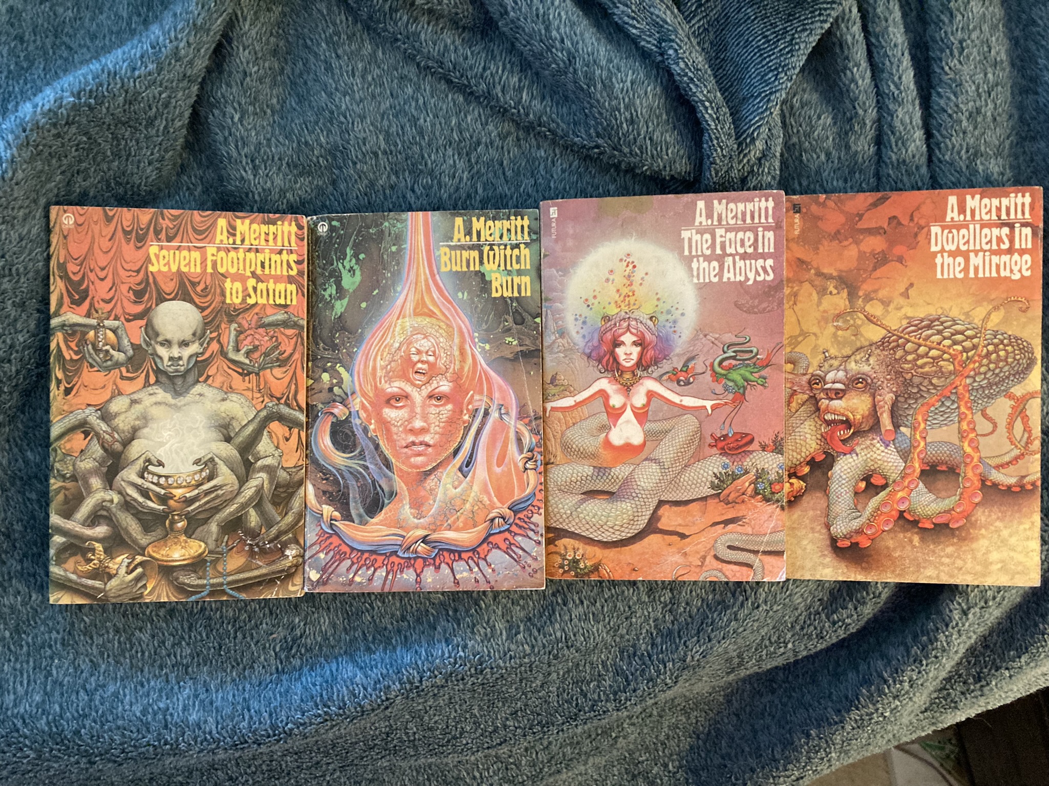 A couple of months ago, I happened to think to myself that I needed to track down and read the few Merritt novels that I haven’t read yet, and as if he was reading my mind, that very day Wayne of Wayne’s Books put up a slew of lovely Merritt editions for sale. I bought quite a few, such as this four-pack: