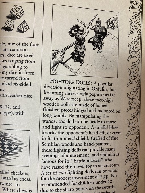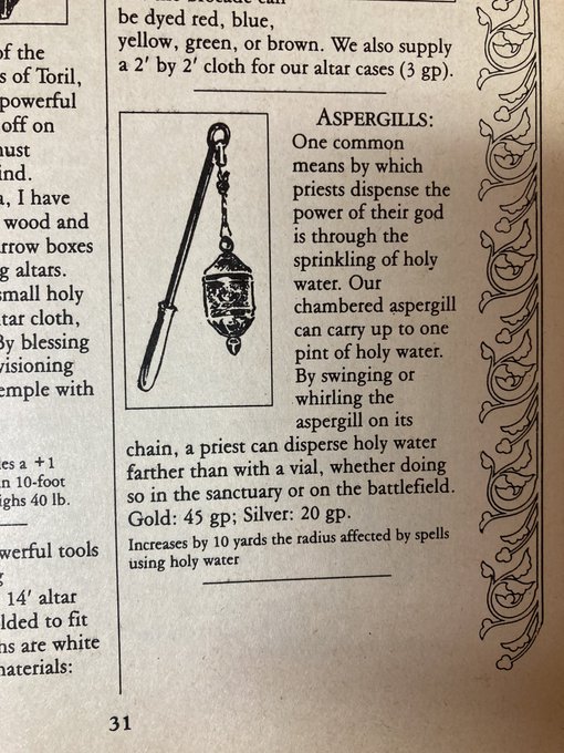 Priests even get their religious trappings, such as this holy water sprinkler. And all material components for wizard and priest spells are given, with costs.