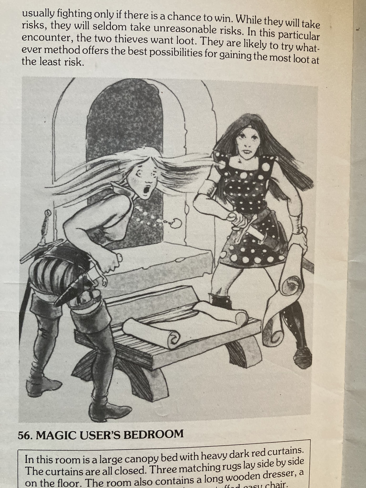 The adventure contains plenty of classic style D&D art, including this hilarious illustration of two thieves caught in the act.
