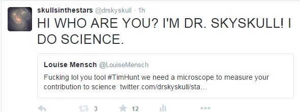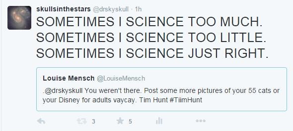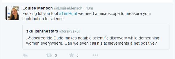Now Hunt argued that his remarks were intended to be a joke, and not taken seriously, but they were definitely inappropriate for a speech in front of a room full of women professionals, especially ones in a field that is well known to treat women very poorly. Furthermore, he defended his comments for a few days after he made them, until the heat really started to turn on.The remarks were pretty widely condemned by scientists and science communicators, with some infamous unsurprising exceptions, and Hunt ended up resigning from a number of prestigious positions. Twitter was filled with people criticizing Tim Hunt for his comments, though it is important to note that Hunt himself was not and never was on Twitter.