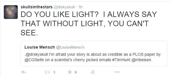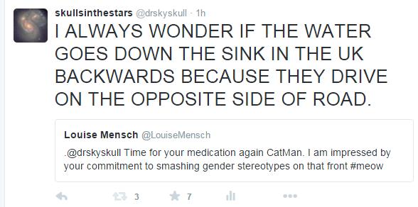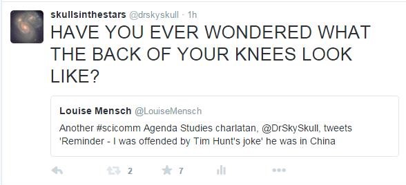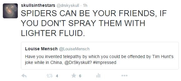 Weirdly, Mensch seemed convinced that nobody was allowed to be offended by Tim Hunt’s comments unless they had heard them in person. Of course, this was also something she wanted to draw me into an argument on. And added more insults to try and upset me by mocking my cats.