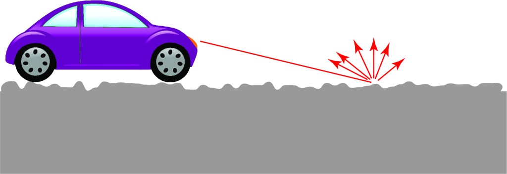 In fact, because the pavement is a rough surface, the light from the headlights scatter in all directions when they collide with the road. This is what we call diffuse reflection, and it is the most common type of reflection you see. Most surfaces are not terribly smooth, and so the light hitting it scatters every which way. In the case of the car, some of the light from the headlights bounces back towards you, so you can see, indirectly, that your headlights are on.