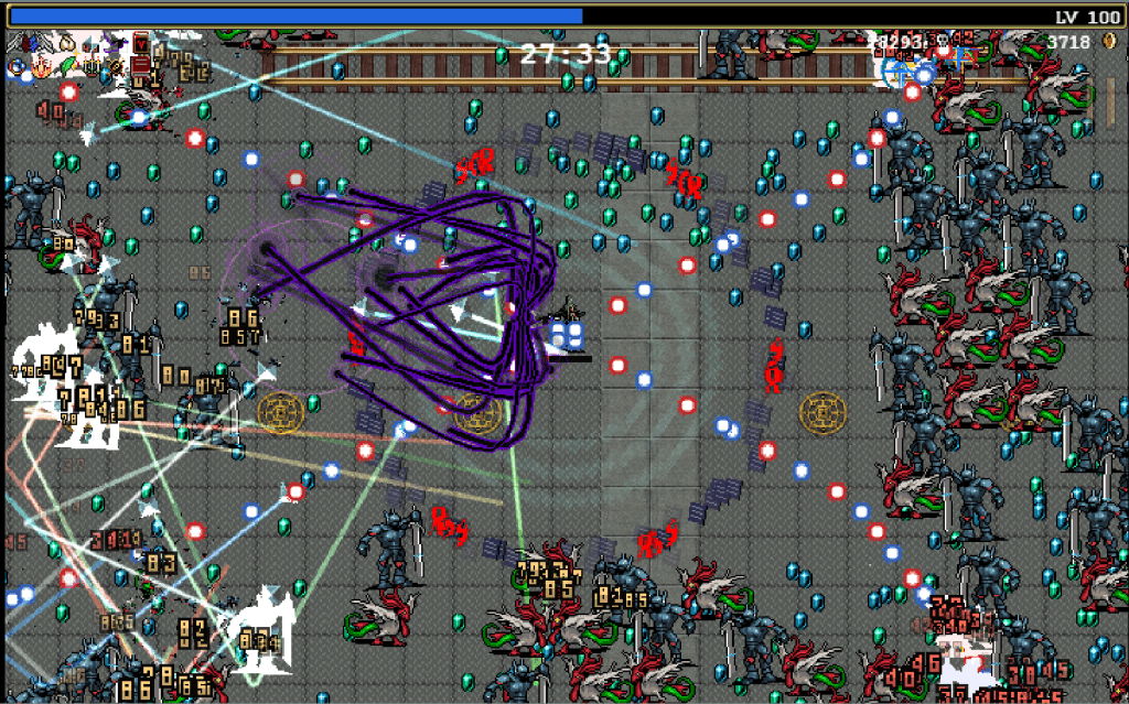Vampire Survivors basically introduced an entirely new type of gameplay, which I have heard referred to as “bullet heaven.” In “bullet hell” games, the entire screen ends up filled with enemy bullets, which must be continuously dodged. In Vampire Survivors, this is reversed: the player builds up an arsenal of ever more powerful weapons, which eventually turns them into a tornado of death, mowing down endless hordes.