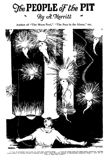 Here we take a quick look at a story by one of my favorite weird fiction authors: Abraham Merritt, who went by A. Merritt in most of his printed work. The story in question is “The People of the Pit,” which first appeared in the All-Story Weekly Magazine in January of 1918; it can be read here. I happened across a reprint that appeared in the first Amazing Stories Annual, published in 1927.