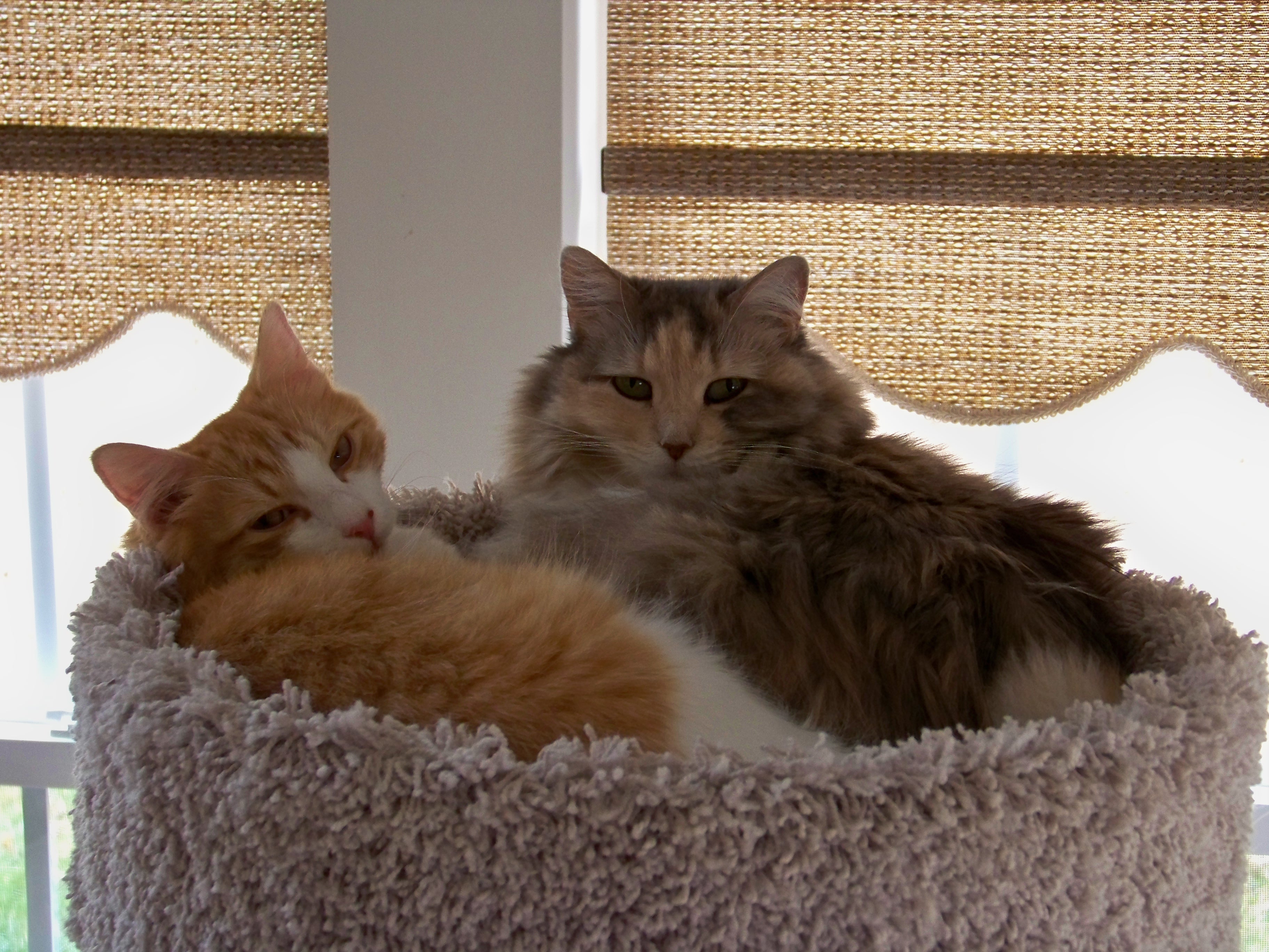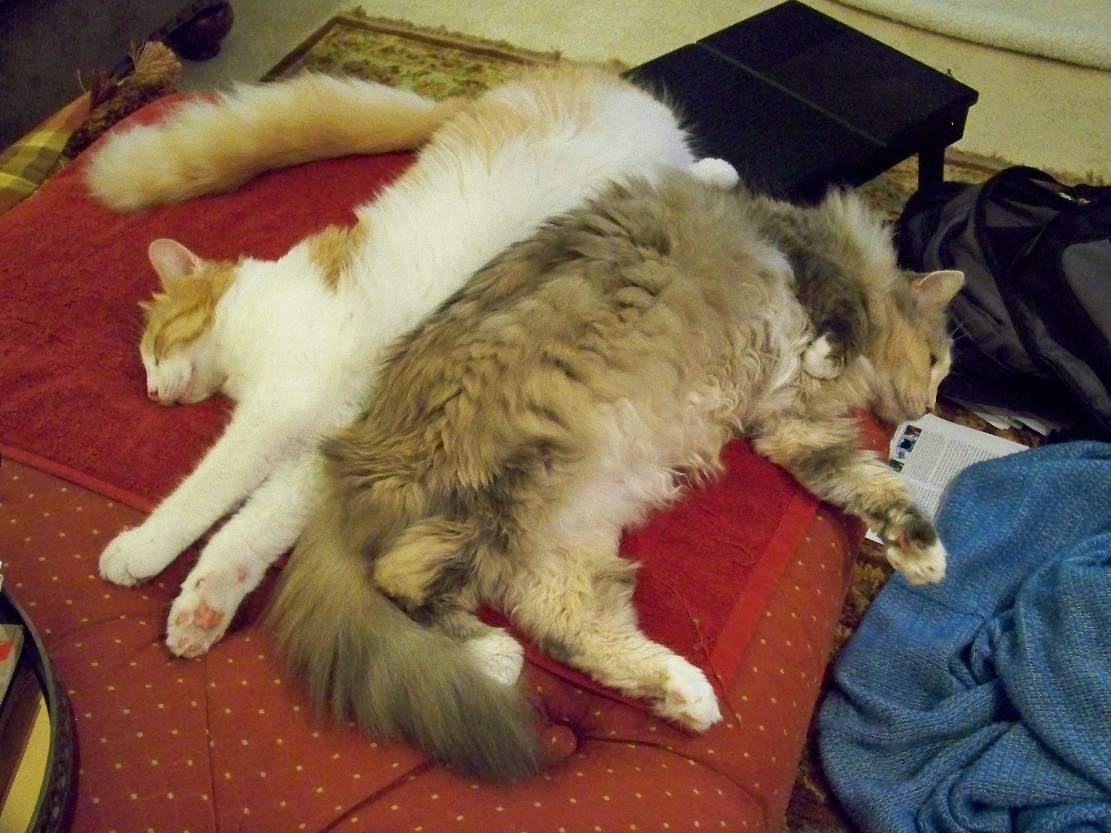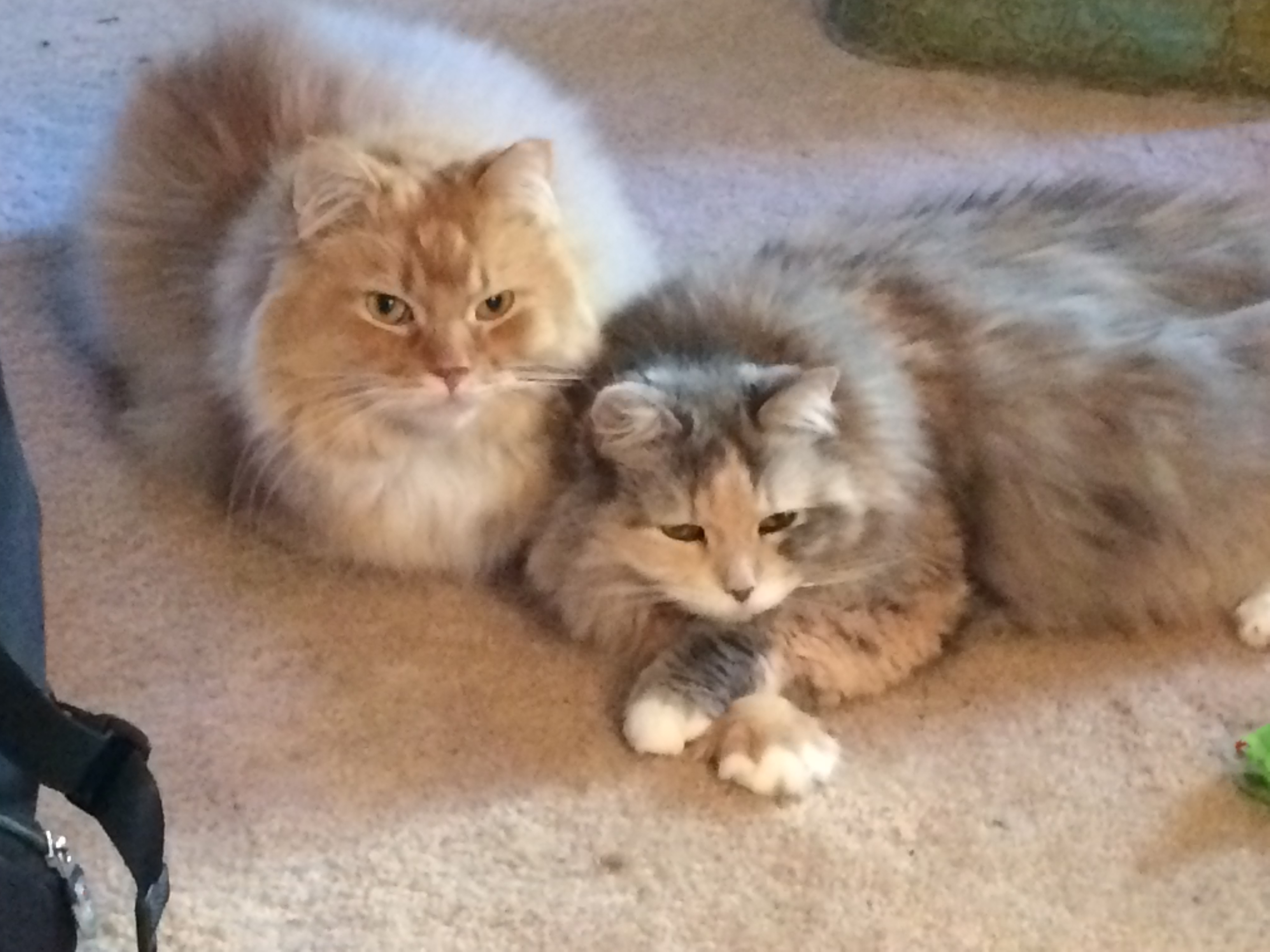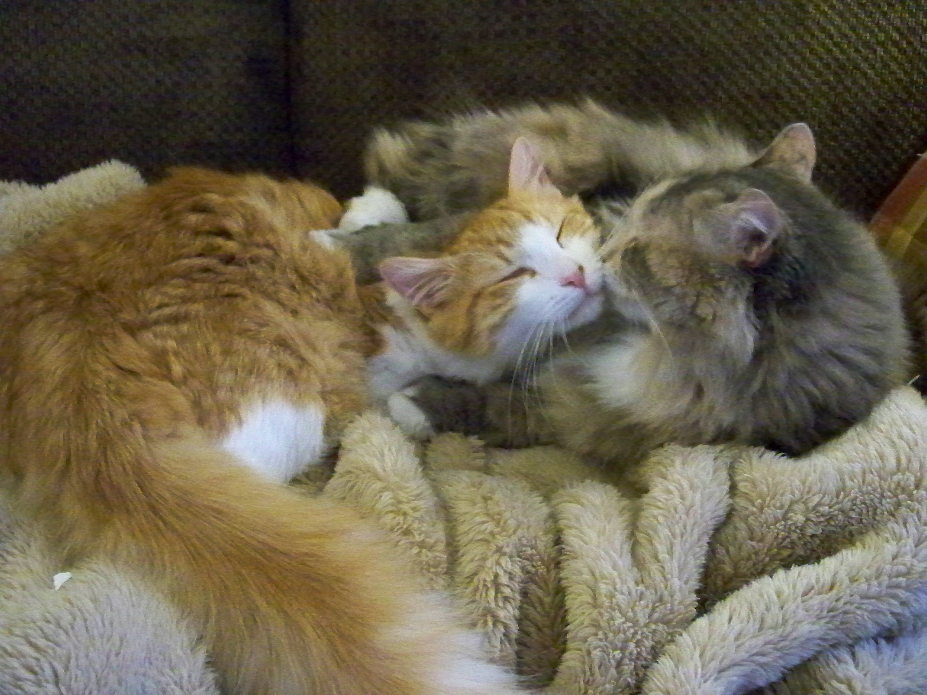 Fluff and Sasha cuddling, with Mandarin looking on with an embarrassing lion cut. He got terrible fur matts, and occasionally needed a full trim.
