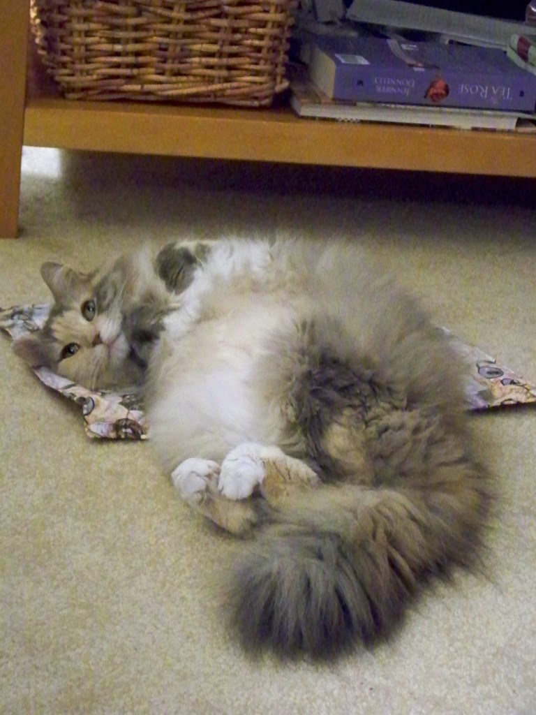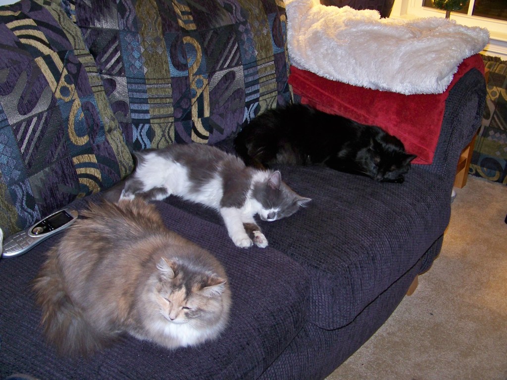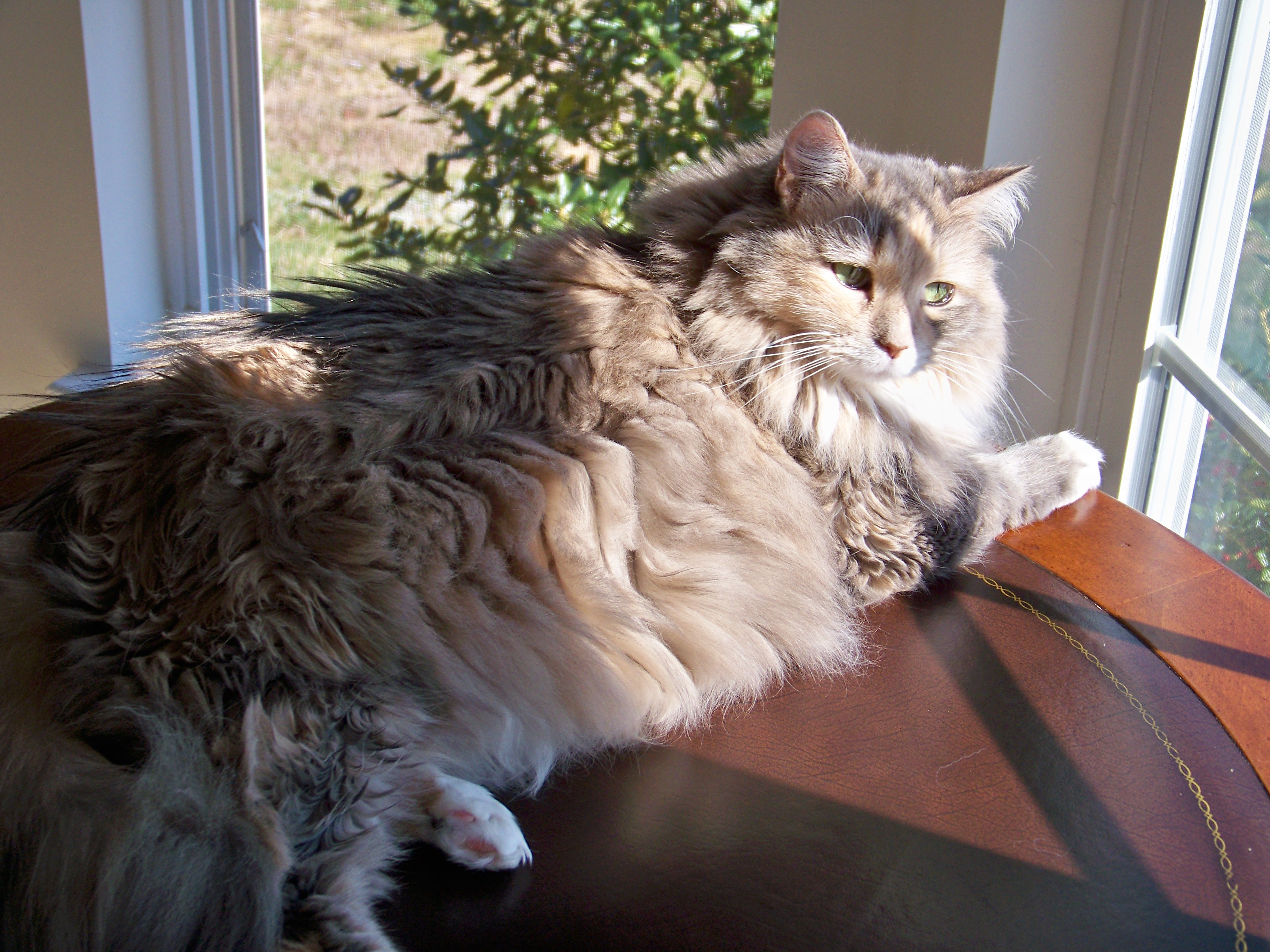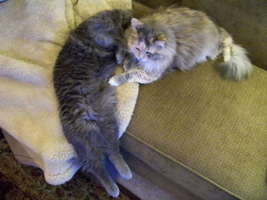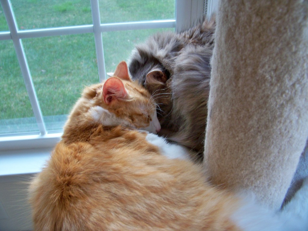 Fluff and Sasha cuddling, with Mandarin looking on with an embarrassing lion cut. He got terrible fur matts, and occasionally needed a full trim.