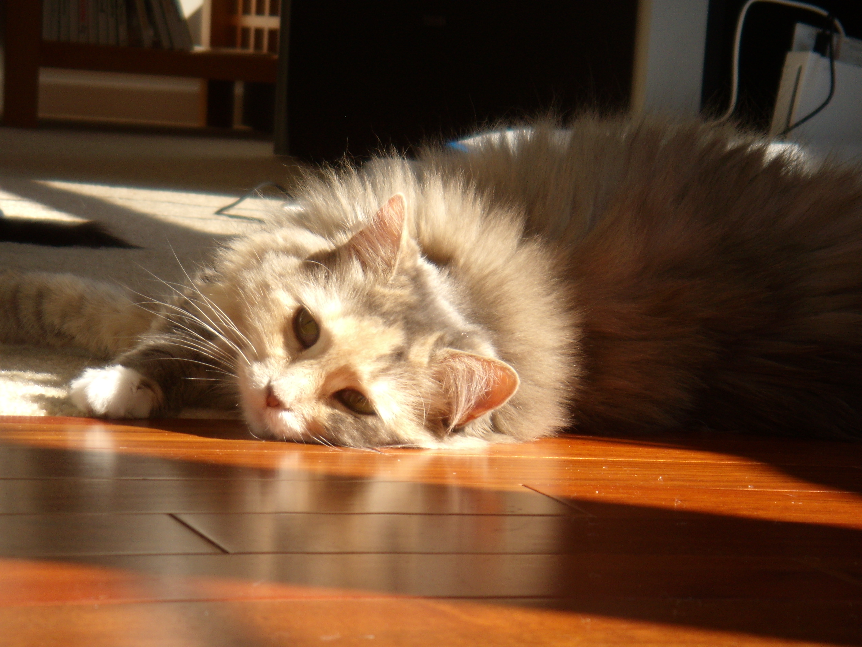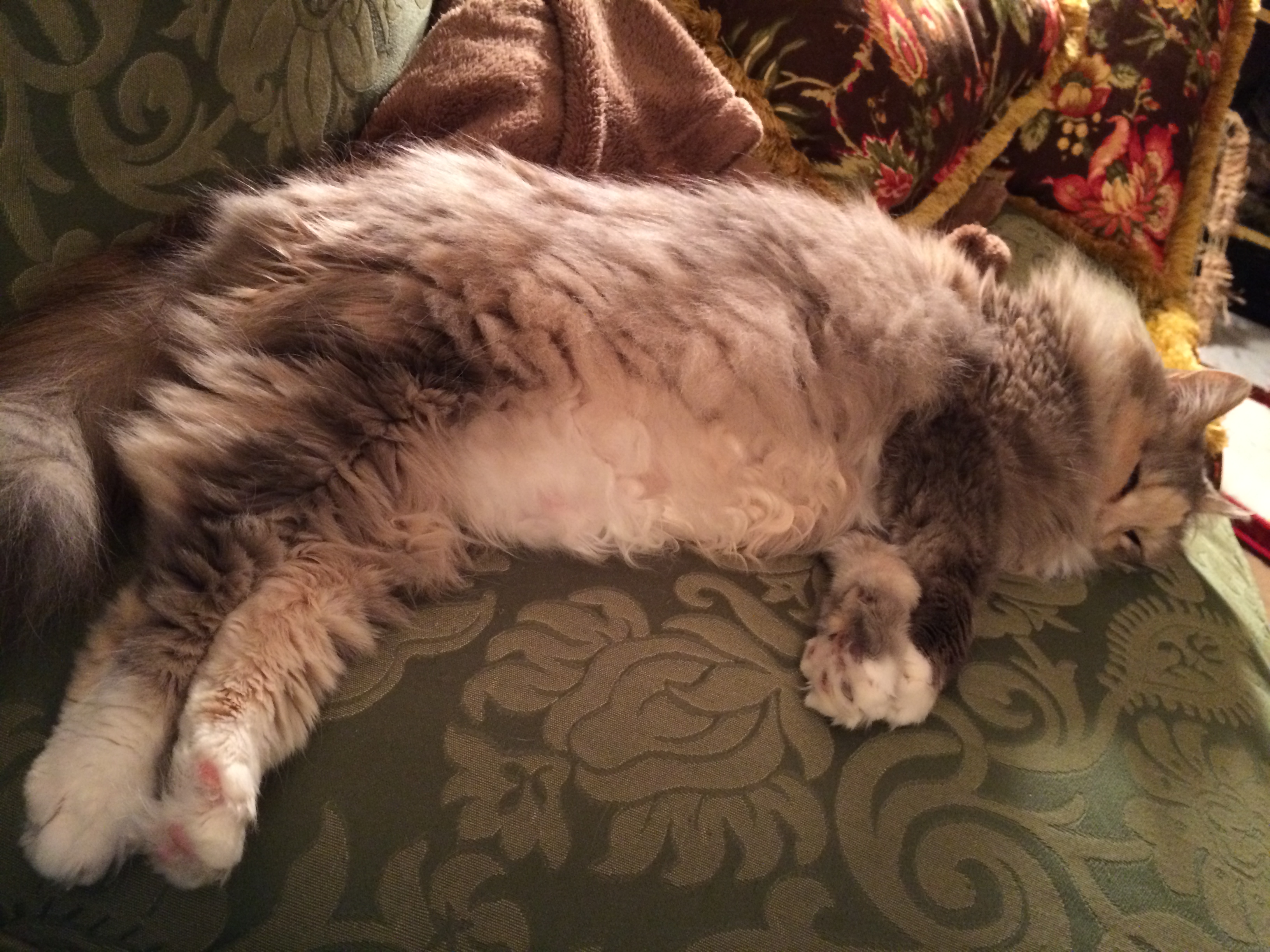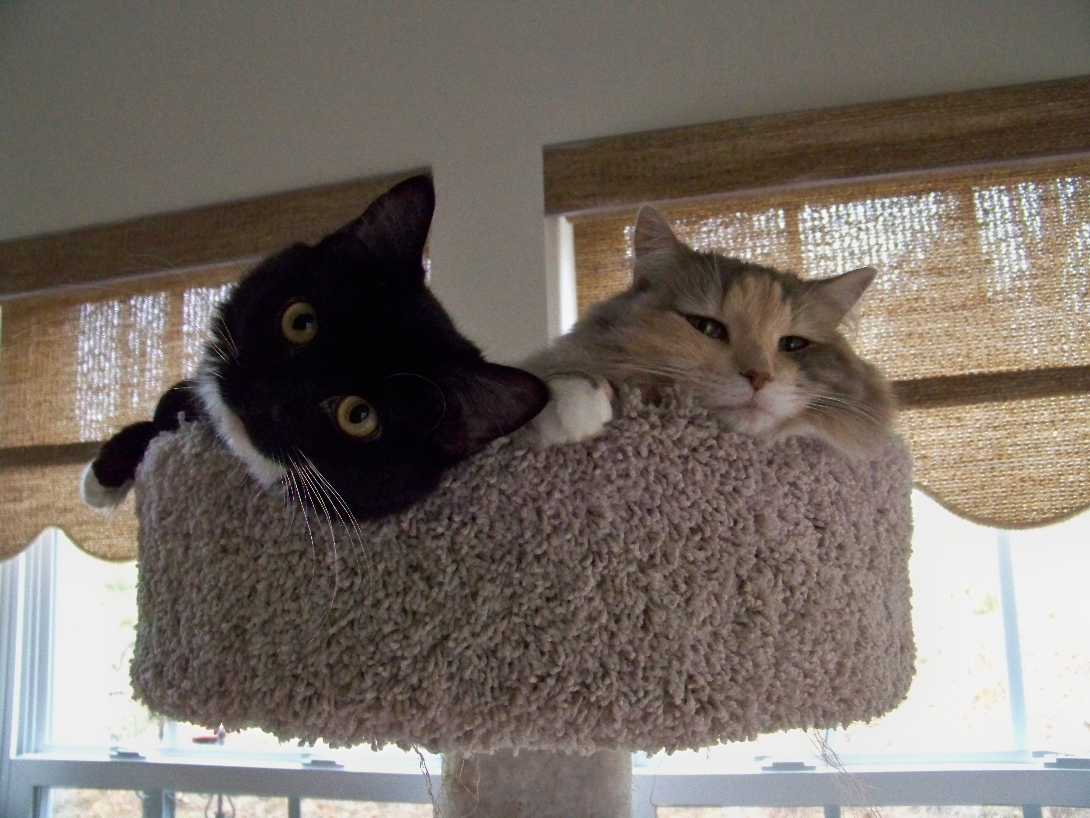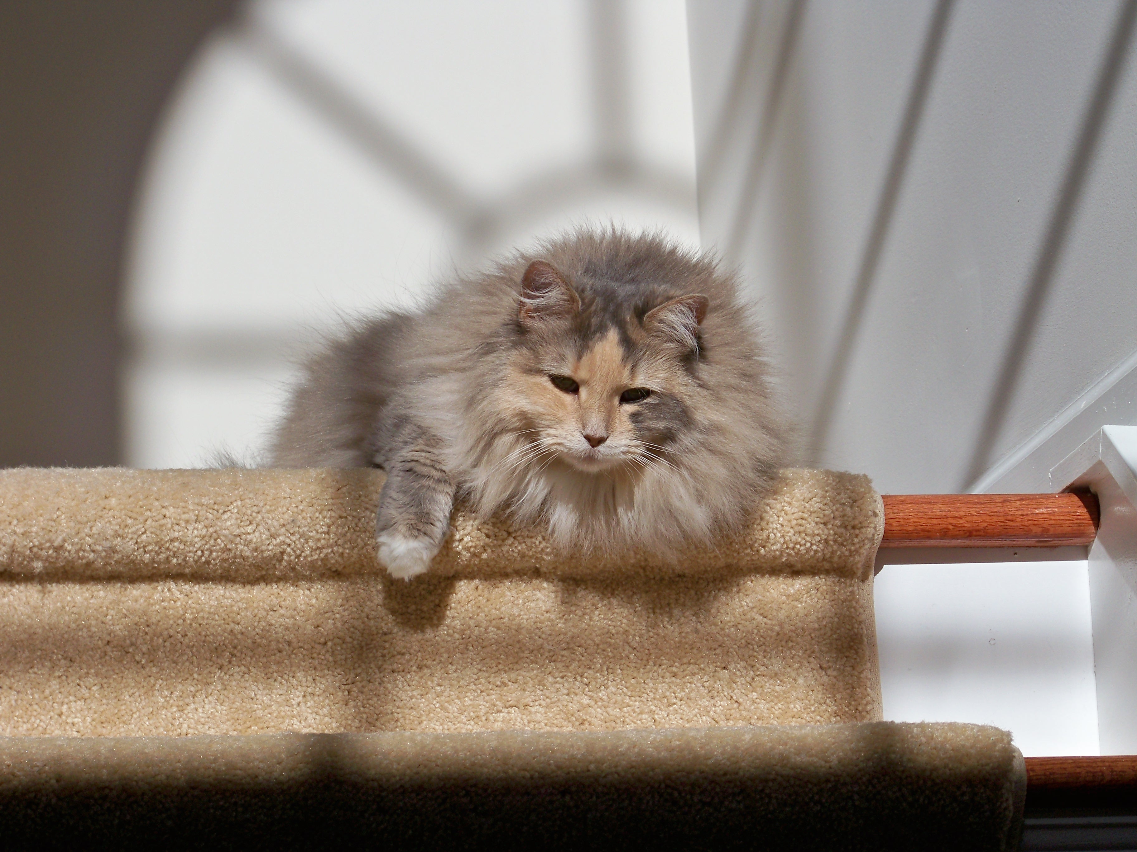 Fluff and Sasha cuddling, with Mandarin looking on with an embarrassing lion cut. He got terrible fur matts, and occasionally needed a full trim.
