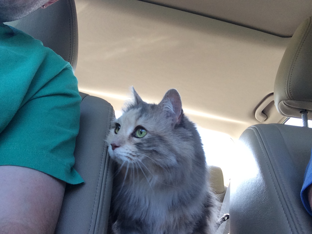 Sasha was also reasonably well-behaved at the vet’s office (though never happy about it). On one journey, Beth let her out of the carrier to sit on the arm rest of the car for the ride home, and after that, Sasha insisted on being let out to see the sights as her compensation for the inconvenience.