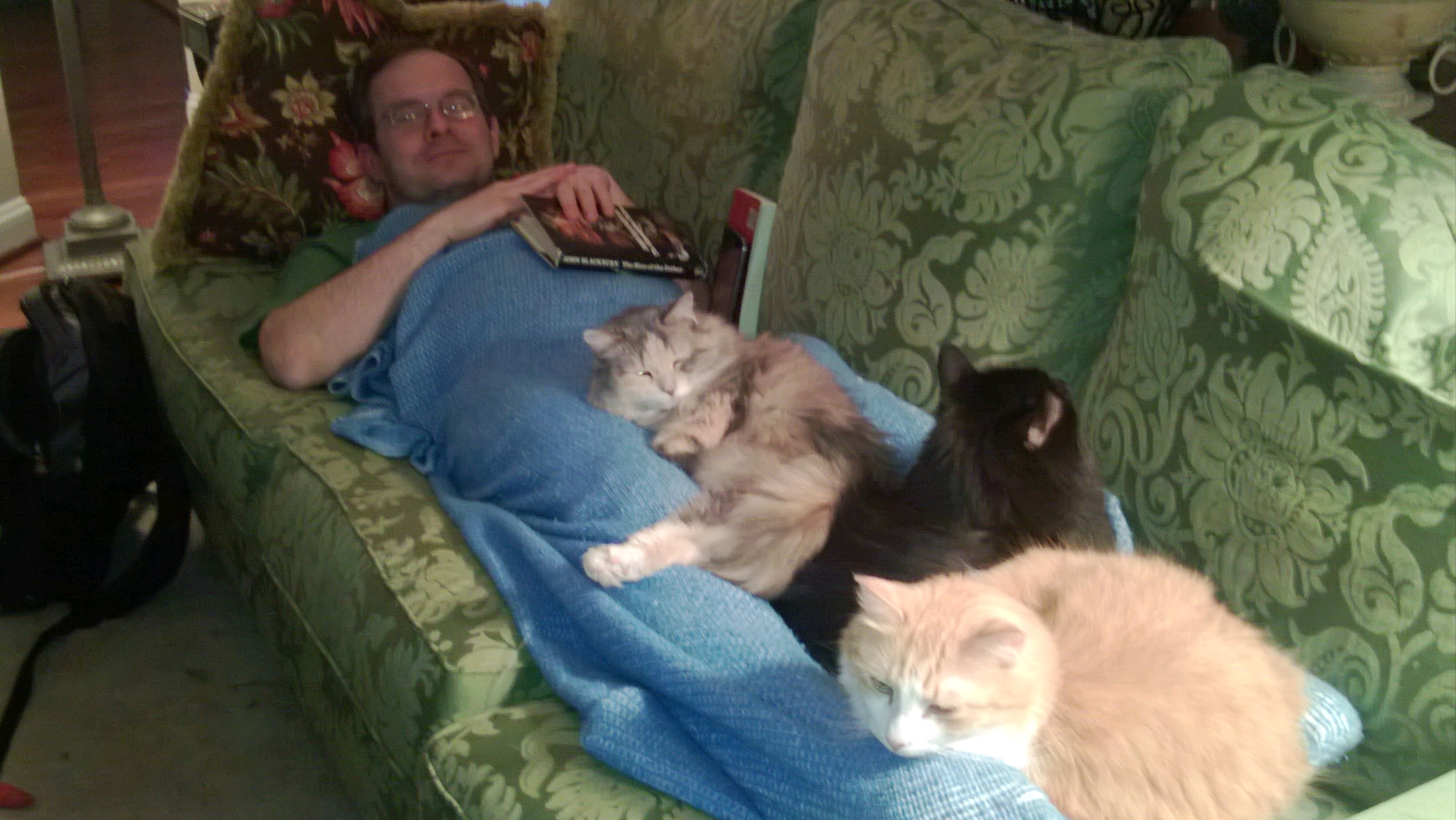 Me, with Sasha, Simon and Fluff on my lap and legs.