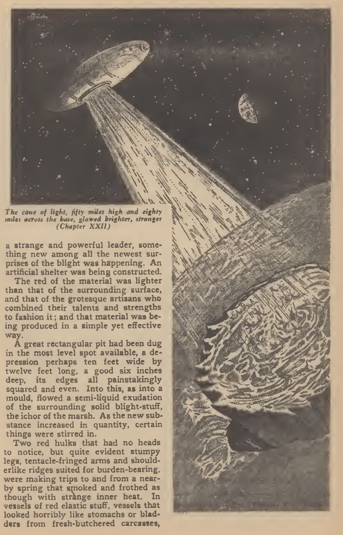 Eventually, the team comes up with a truly incredible plan: they built an atomic rocketship that can fly by anti-gravity, and use a nuclear beam weapon to literally cut away the surface of the Earth that the blight has overwhelmed, much like removing a cancerous tumor from a patient. Using anti-gravity, the blighted region is launched into space, and Earth is saved!