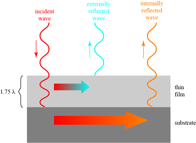 The rest of the incident wave enters the film and propagates to the substrate layer (a lens, to continue our example). Part of that wave reflects off of the substrate, shown in orange, and travels back out of the film; it also flips sign when it reflects off of the substrate, which is assumed to have a higher refractive index than the thin film.