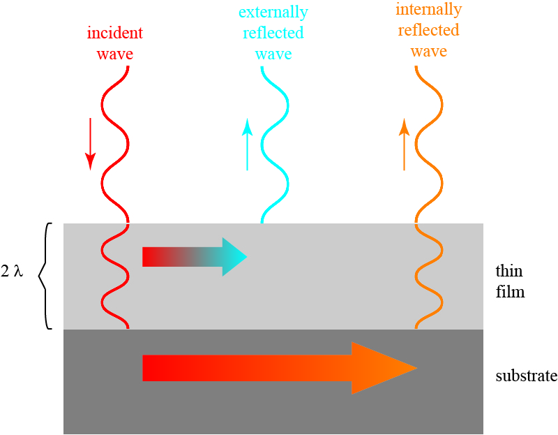 The thickness of the thin film is key in this. Because of that odd 1/4 wavelength thickness of the film, the light reflecting off of the substrate will travel an extra 1/2 wavelength compared to the wave that is directly reflected. This means that the two waves will be “out of phase,” and oppose each other.