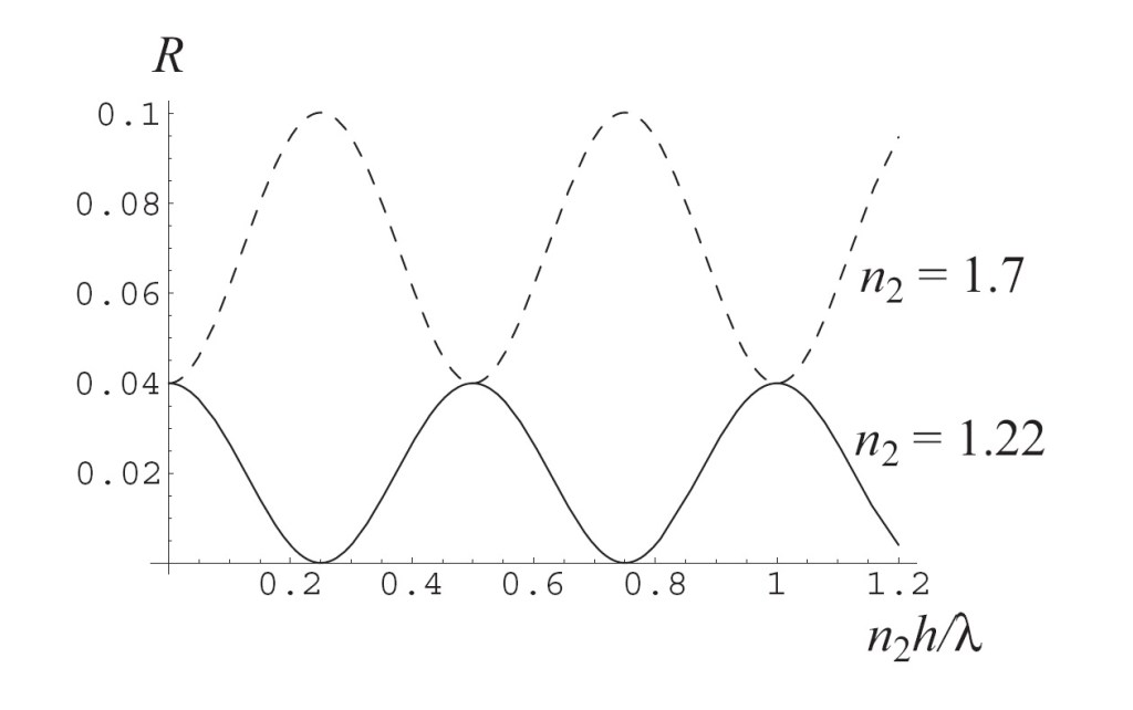 These two figures, taken together, show that the thickness of the film, relative to the wavelength, is crucially important. In fact, here is a figure I use to demonstrate antireflection/enhanced reflection as a function of optical thickness nh of the film relative to the wavelength λ.