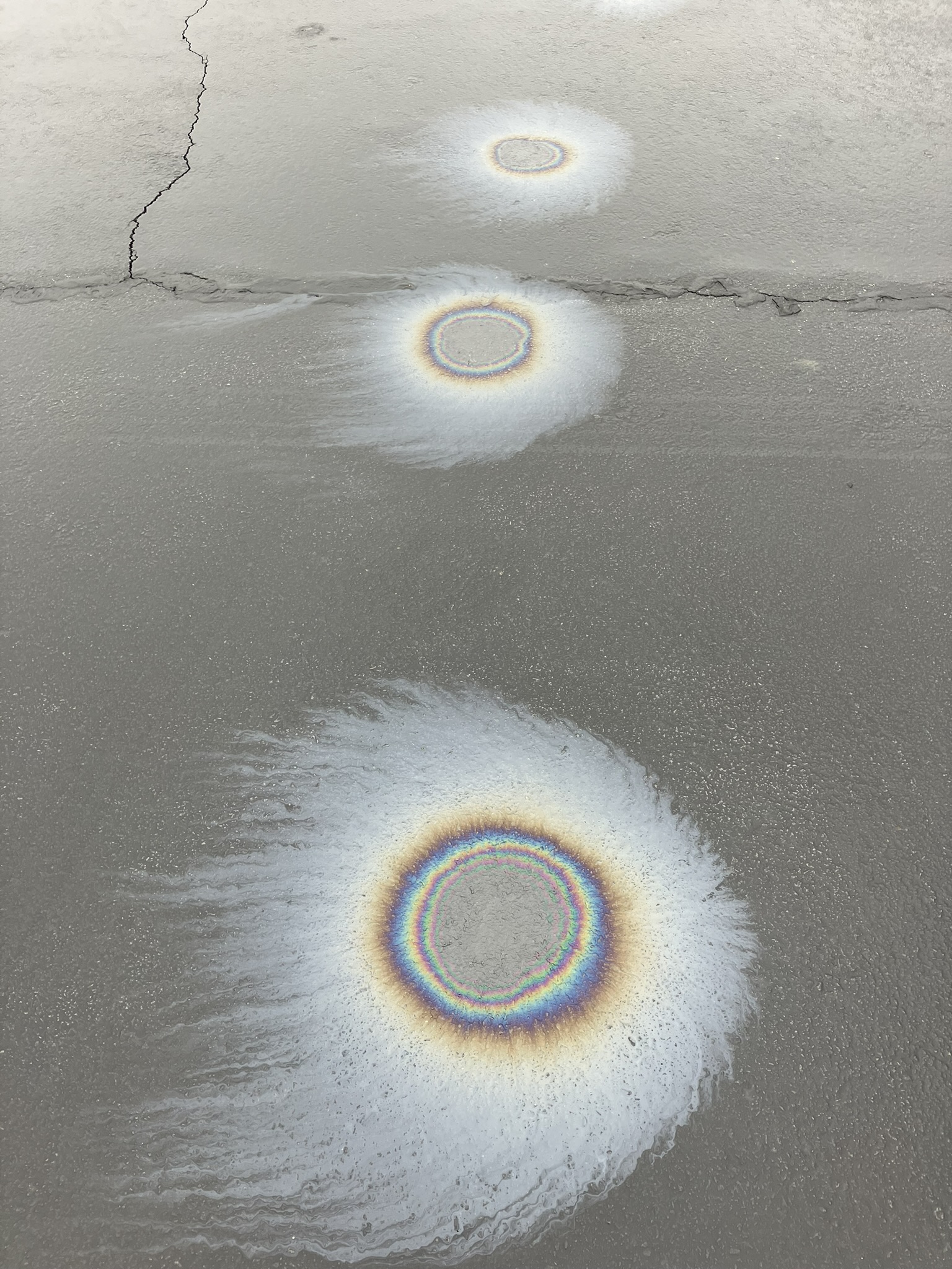 What this means is that, for a given film, some colors will be very strongly reflected and other colors will not. This is the origin of the bright colors of an oil spot, as shown at the beginning of the post and shown again below for convenience: