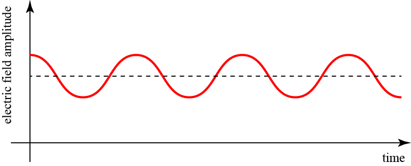 Let’s start with a discussion of light traveling through matter; in fact, some of the most surprising results will arise when we talk about light traveling in a vacuum! We consider, at first, a single frequency (i.e. “single color”), or monochromatic, wave. If we were to plot the “ups and downs” of a single frequency wave in time, it would look something like this: