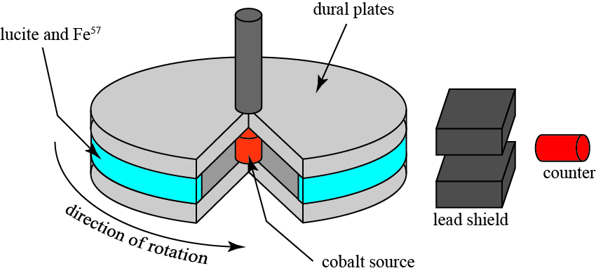 The cobalt source is on axis, and sandwiched between two dural (aluminum alloy) plates. A cylindrical shell of lucite lies between the dural plates, coated with an Fe57 (iron-57) film. A lead shield collimates the outgoing gamma rays by blocking those that don’t pass right to the detector, which is a counter that simply counts how many gamma rays per second are detected.