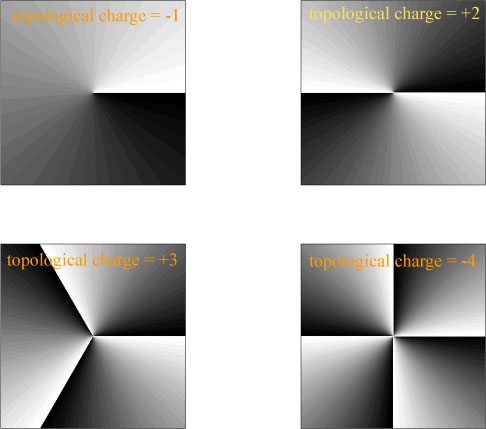 We fast forward to 1974, when physicists John Nye and Michael Berry noted1 that light waves can have structures analogous to defects in crystals, known as dislocations. These dislocations have a very regular and predictable form, in which the phase of the light wave circulates around a central point of zero intensity. If we look at the phase of typical vortex beams in a cross-section, we see examples such as follow.