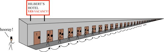 We can go further, though: we can ask every guest to move again to the next highest room, and repeat this process indefinitely, to make as many vacancies as we like! Hilbert’s Hotel therefore simultaneously has no vacancies and an infinite number of vacancies!