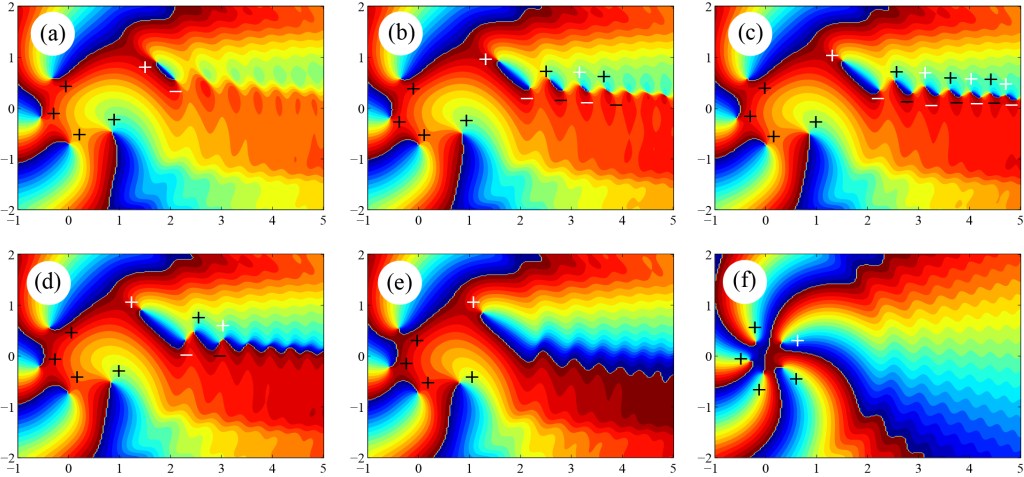 In (a) and (b), the vortex order approaches 4.5, and you can see that pairs of vortices (labeled + and -) are created; I use black and white to distinguish those pairs that are created together. When the vortex order is exactly 4.5, in (c), there are an infinite number of pairs. As the order goes above 4.5, the singularities annihilate from infinity inwards, with each negative vortex annihilating with its opposite neighbor to the right. The net result is that we are left with one extra positive vortex in (f)!