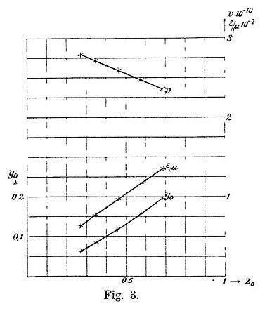 Kaufmann’s “raw” experimental results are shown below; electrons are emitted with a range of speeds, resulting in a line of measured data. The figure shows, in essence, the same data in three different forms. The first form shows the measured positions of the electrons as deflected along the y0 and z0 directions by the electric and magnetic fields, respectively, and is closest to what would have been recorded on the photographic plate. The second form shows how the velocity of the electrons depends on the z0 position. The third form shows how the charge/mass ratio depends upon z0.